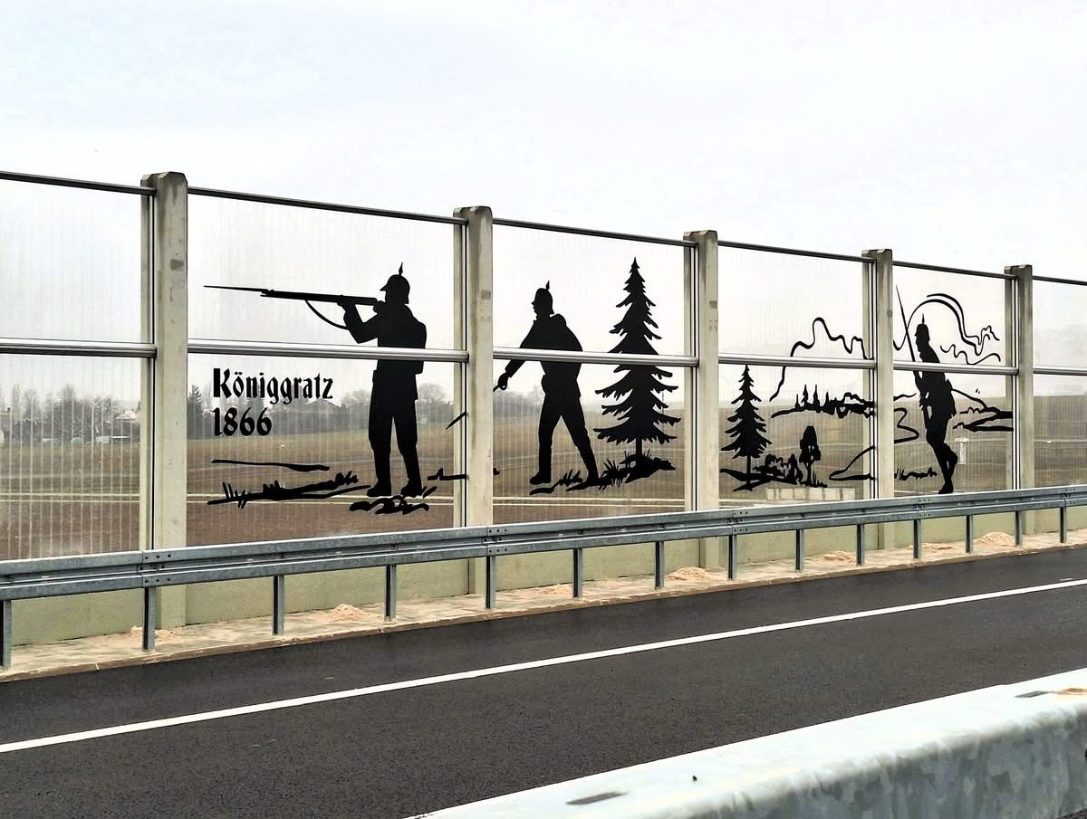 Nová komunikace vede místy bitvy u Hradce Králové, tu připomínají speciální motivy na protihlukové stěně. Ta je mezi obcemi Sovětice a Sadová v místech, kde předvoj první pruské armády 3. července 1866 překročil říčku Bystřici a pokračoval na Sadovou.