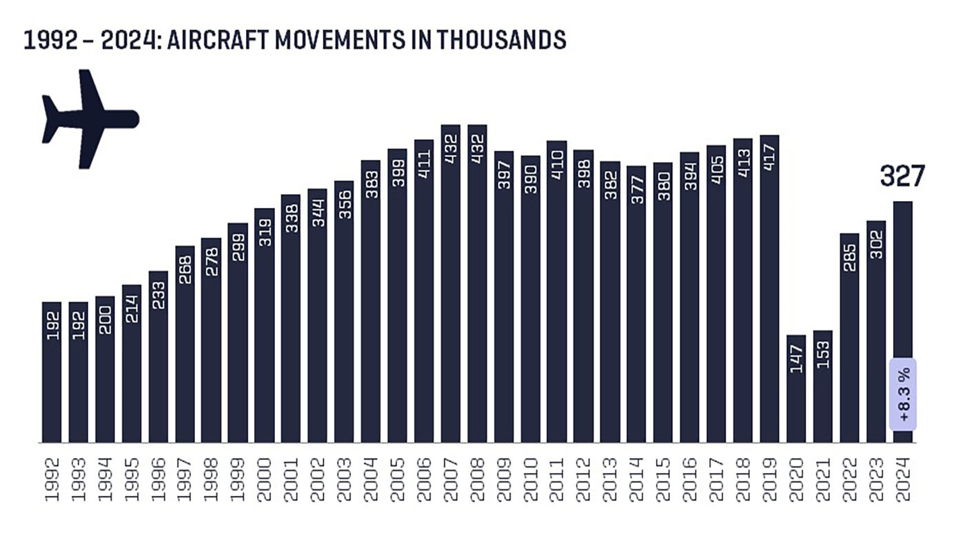 Na mnoha letištích se počet pohybů nikdy nevrátil na úroveň roku 2008, ač počty cestujících vystřelily nahoru. Ruzyně je zrovna takový případ, z okolních letišť třeba Mnichov. https://www.munich-airport.com/_b/0000000000000008251845bb5e1d709c/flugbewegungen-en.png