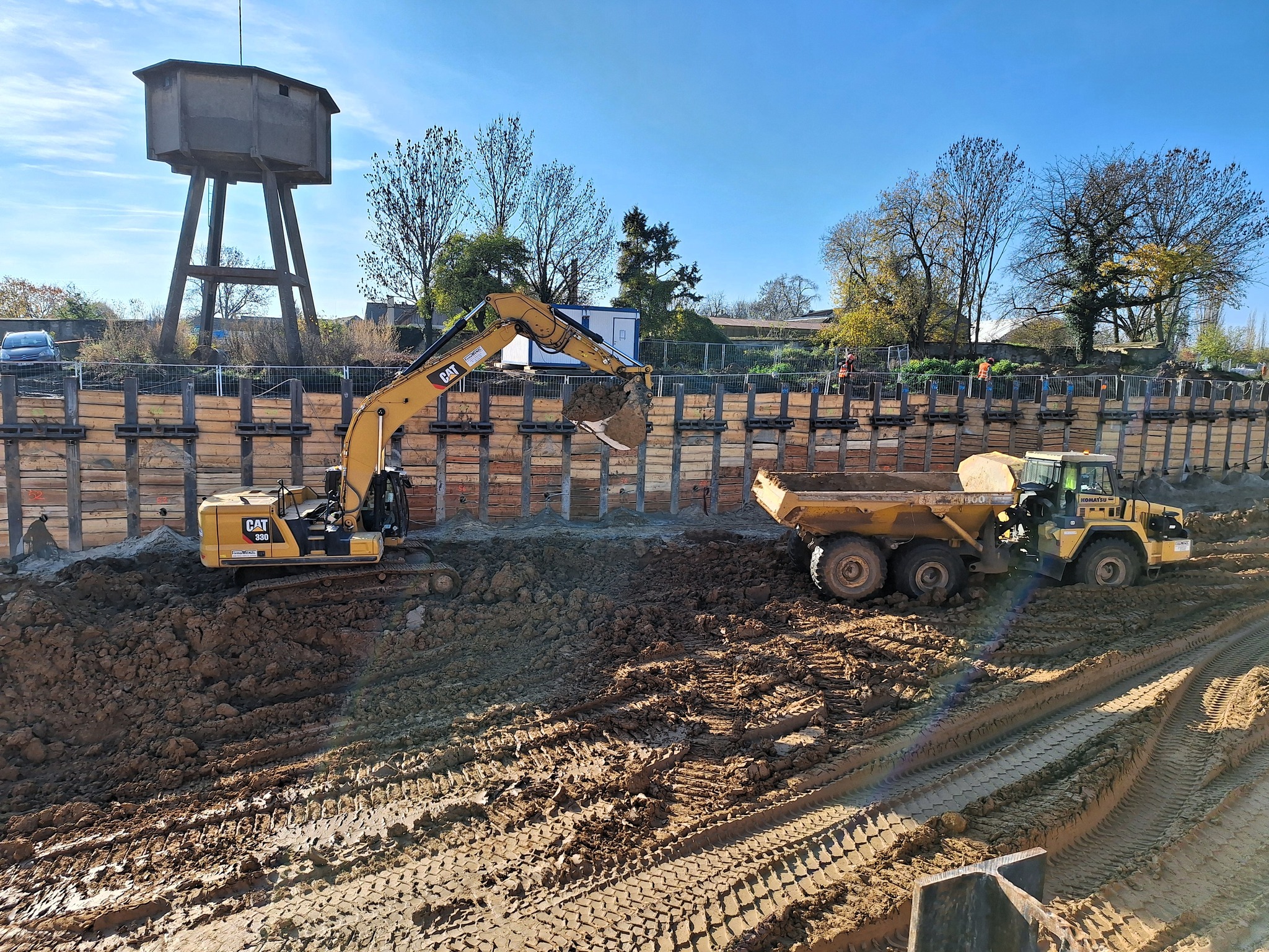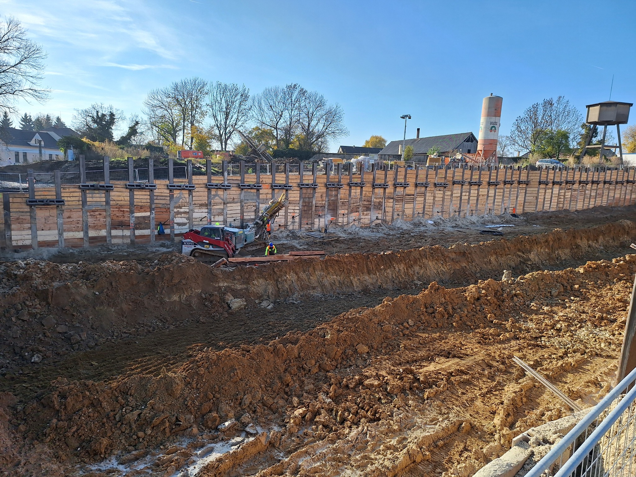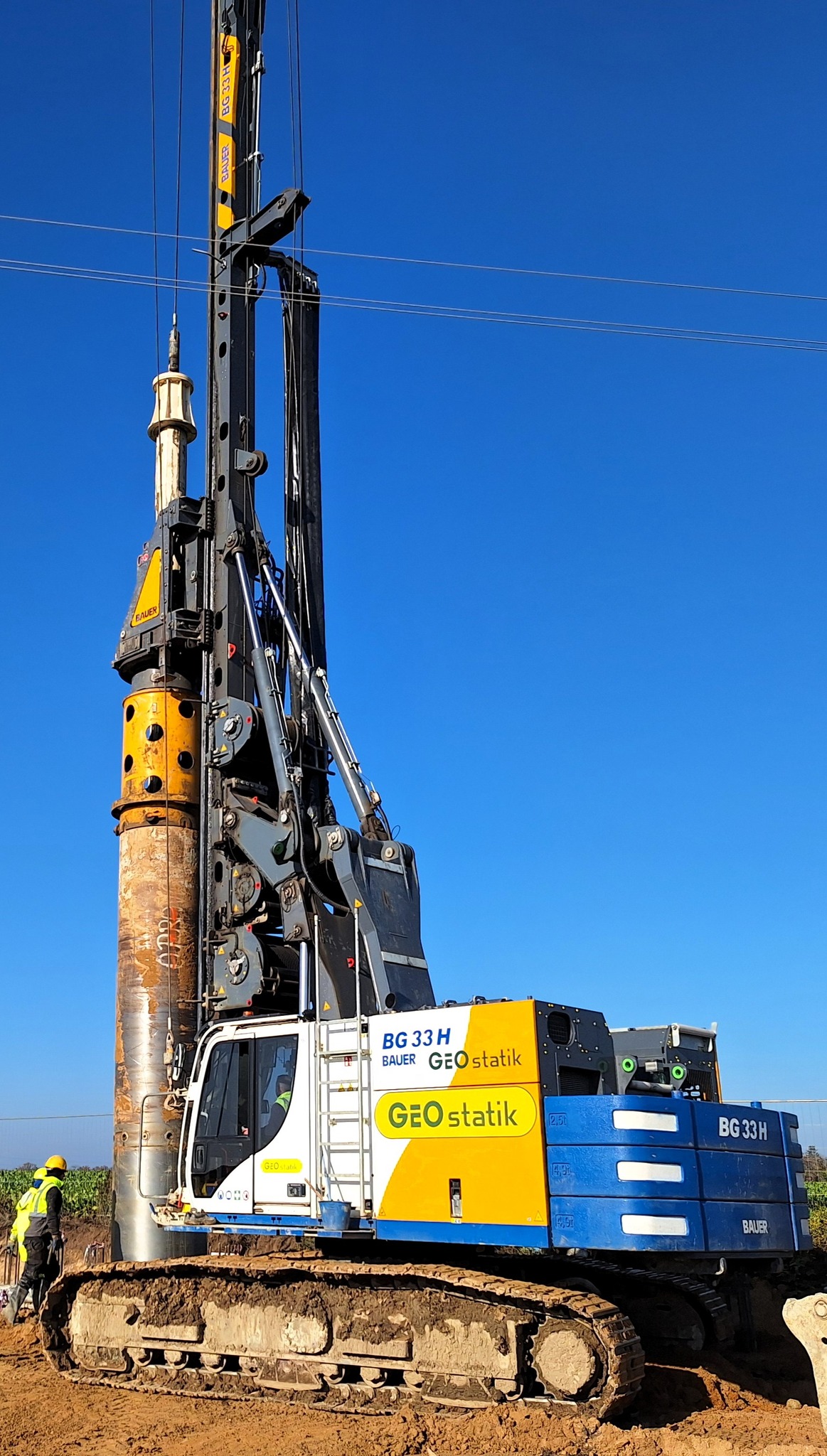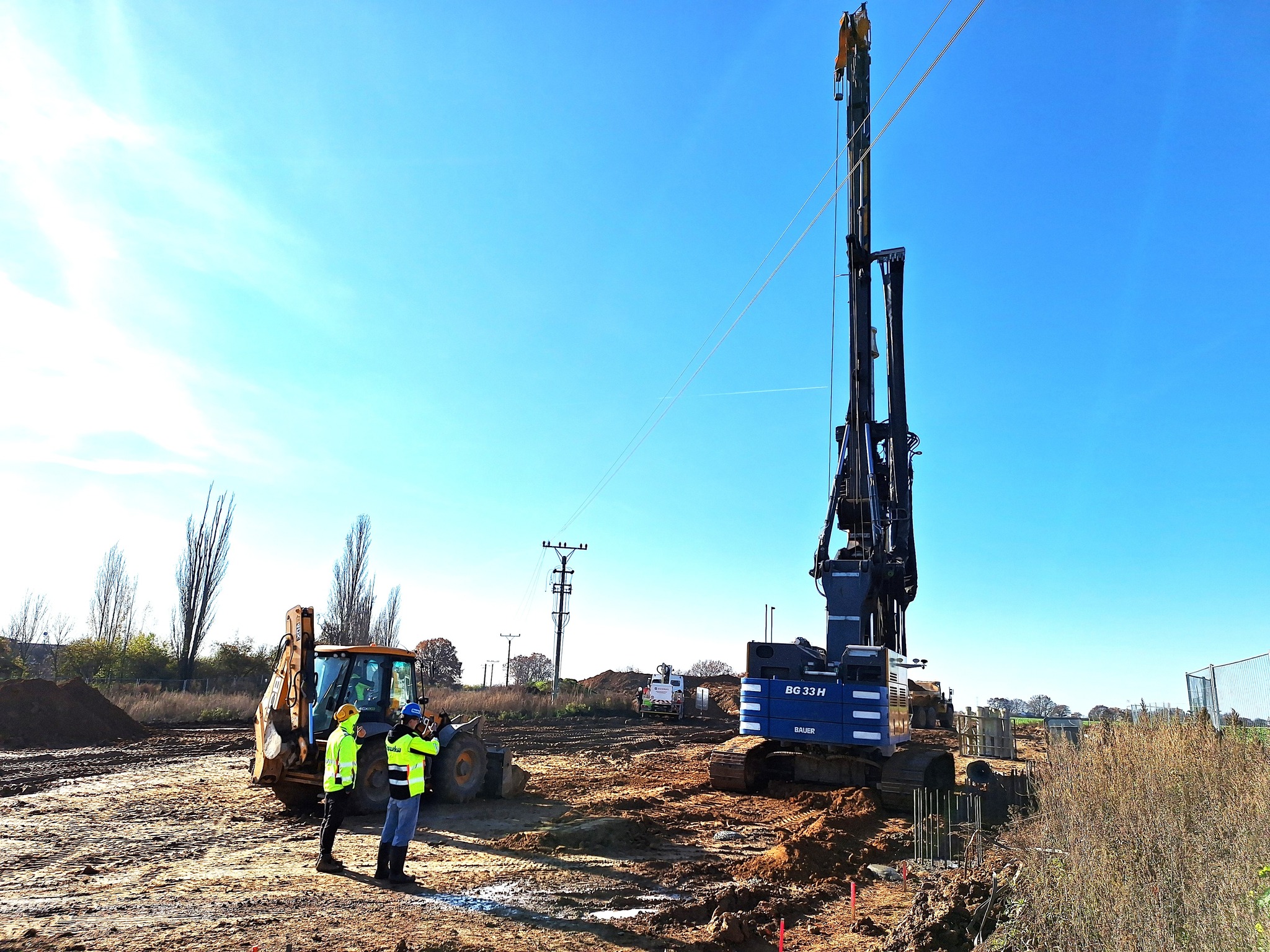 S její pomocí se vrtají piloty do hloubky až 16 metrů pro budoucí pilotovou stěnu, která bude po obou stranách zářezu. Pilot bude celkem 132.