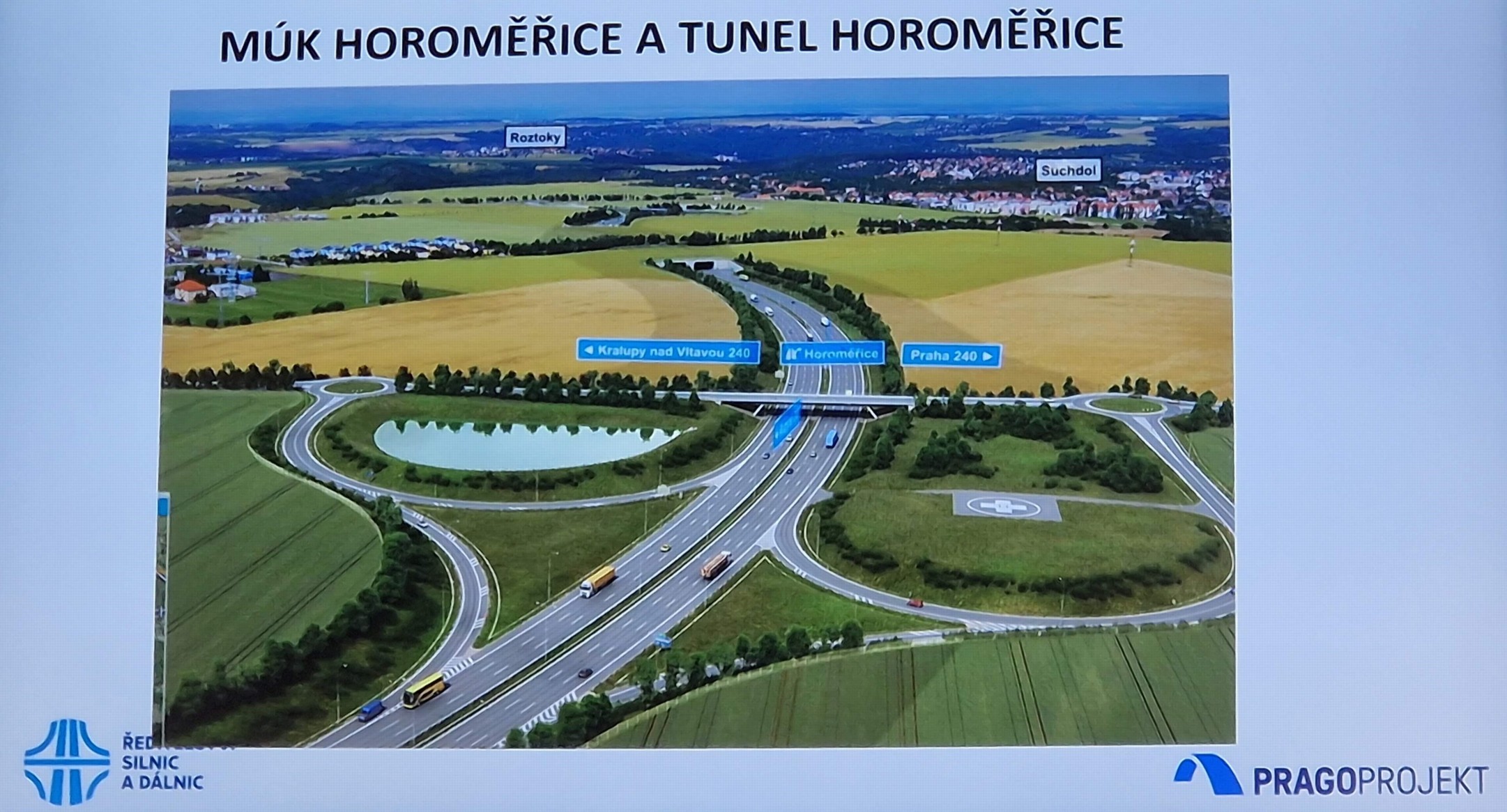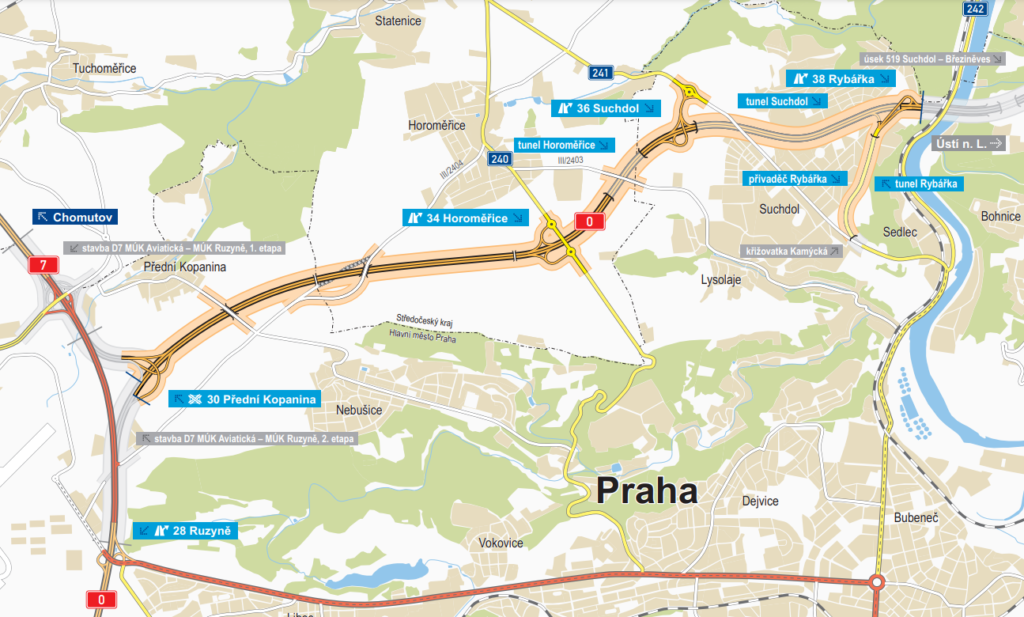 Za MÚK Horoměřice bude vjezd do prvního tunelu, u kterého vznikne i místo pro přistání záchranářského vrtulníku. Další tunel povede pod celým Suchdolem.
