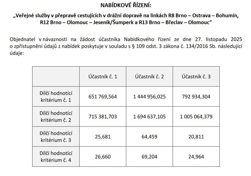 České dráhy jsou v tabulce účastník 1, RegioJet 2 a Leo Express 3. České dráhy jsou cenou výrazně nejnižší. Dvě hlavní hodnotící kritéria jsou výše požadované kompenzace v cenové hladině roku 2025 pro celý soubor linek za průměrný provozní den v základním období I (23 %) a kompenzace za druhé základní období (69 % váhy).
