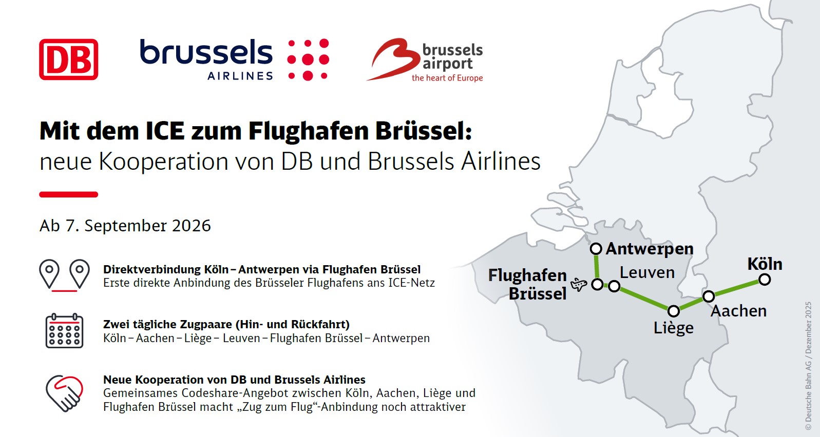 Pro letiště v Bruselu půjde o obnovení napojení na síť evropských rychlovlaků. Brussels Airlines má v dálkové dopravě silnou síť linek zejména do Afriky. „Západní Německo je domovem významné africké komunity, kterou nyní můžeme propojit s naší sítí v subsaharské Africe. Naše dohoda s Deutsche Bahn zajišťuje bezproblémové a klimaticky šetrné spojení. Pracujeme na tom, abychom v budoucnu nabídli další spojení,“ řekl ředitelka Brussels Airlines Dorothea von Boxberg.