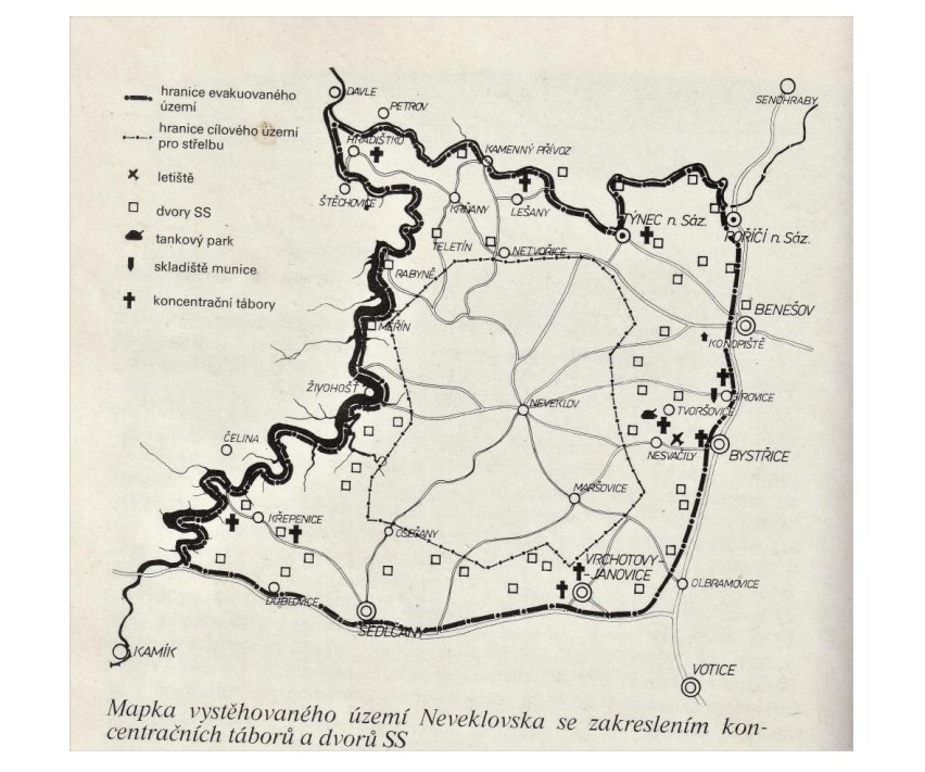 Cvičiště vojsk SS vzniklo na Benešovsku v roce 1942. Vnější hranice cvičiště vedla po Vltavě na soutoku se Sázavou, proti proudu Sázavy do Poříčí nad Sázavou, odtud po silnici do Benešova a dále po železniční trati k silnici I/18 u Olbramovic a podél silnice I/18 k mostu přes Vltavu.