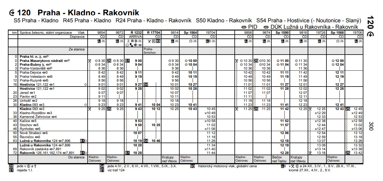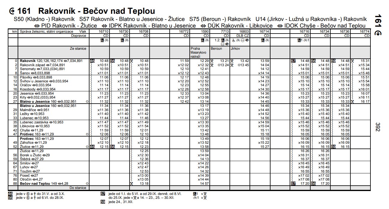 Spoj vyrazí z Masaryčky každý den v 11:00, až do Rakovníka jede jako spěšný. Z města mýdla a obkladaček pak vyráží ve 12:29 a staví ve všech stanicích a zastávkách. Do Bečova nad Teplou spoj dorazí v 14:57.