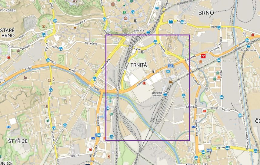 Nové tramvajové tratě v Trnité. Foto: Brněnské komunikaceUmístění Trnité v Brně. Foto: Mapy.comPodoba tramvajových tratí v Trnité. Foto: Kancelář architekta města BrnaPodoba tramvajových tratí v Trnité. Foto: Kancelář architekta města BrnaPodoba tramvajových tratí v Trnité. Foto: Kancelář architekta města BrnaNový bulvár spojující centrum Brna s novým nádražím.