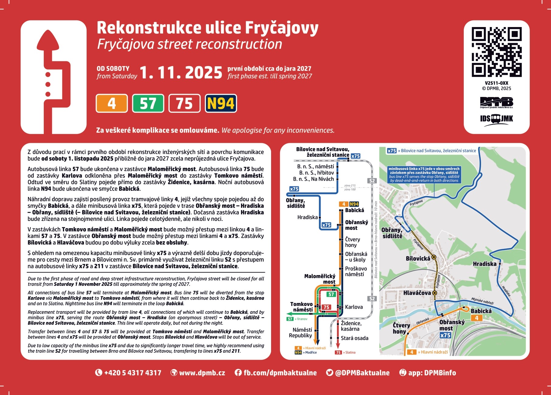 Ve středu 15. října začíná nultá etapa rozsáhlé rekonstrukce brněnské Fryčajovy ulice. Ta potrvá celkem dva roky a ovlivní celou severovýchodní oblast města i jeho okolí. Kvůli dopravním omezením vypukl v létě mezi obyvateli městských částí občanský odpor.
