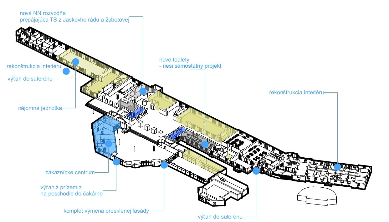 Tragikomickým dojmem na mně zapůsobila nenápadná poznámka na obr. 3/6: „Nové toalety – rieši samostatný projekt“