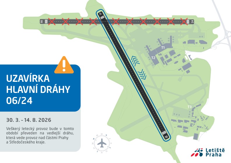 Veškerý provoz Letiště Václava Havla bude na 4,5 měsíce opět přesměrován nad hlavy statisíců obyvatel západních čtvrtí Prahy. Letiště Praha oznámilo, že v pondělí 30. března zahájí druhou etapu uzavírky hlavní dráhy 06/24. Potrvá až do 14. srpna, tedy do poloviny hlavní sezóny, kdy z a do metropole míří nejvíce letů.