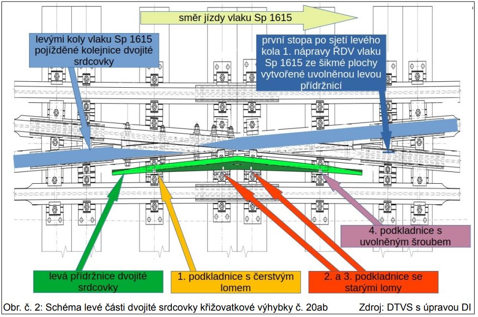 Analýza Kriminalistického ústavu pak odhalila, že k lomům bočnic podkladnic k přídržnici dvojité srdcovky došlo vlivem uvolnění šroubových spojení mezi přídržnicí a podkladnicemi. Tím pak docházelo ke zvýšenému dynamickému namáhání přídržnice a podkladnic koly. Z této analýzy vycházela i Drážní inspekce.
