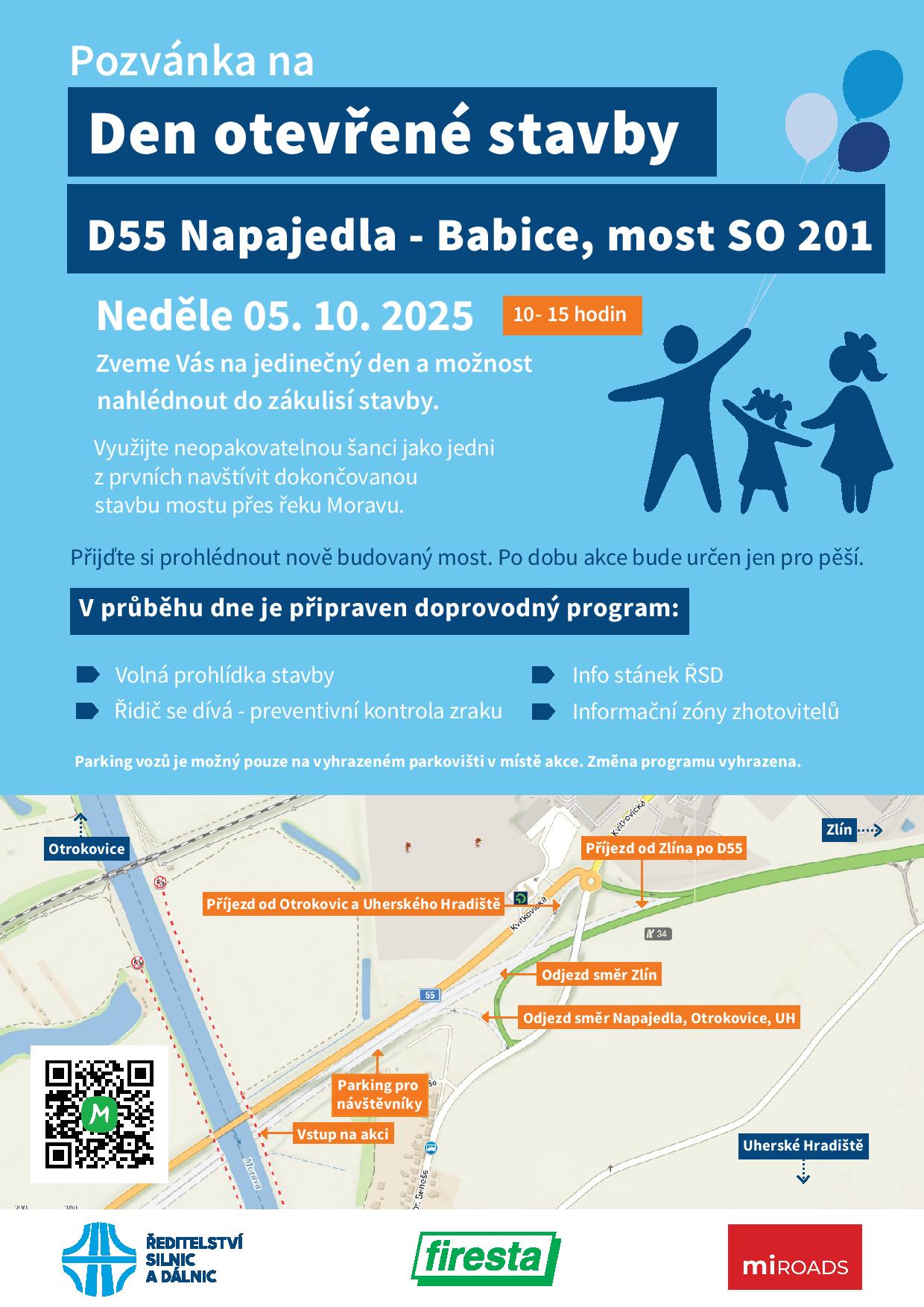 Ředitelství silnic a dálnic připravilo na sobotu a neděli dny otevřené stavby na dálničním mostě u D55 a současně na novém úseku D55 z Olomouce do Kokor. Obě stavby budou hotové do konce letošního roku