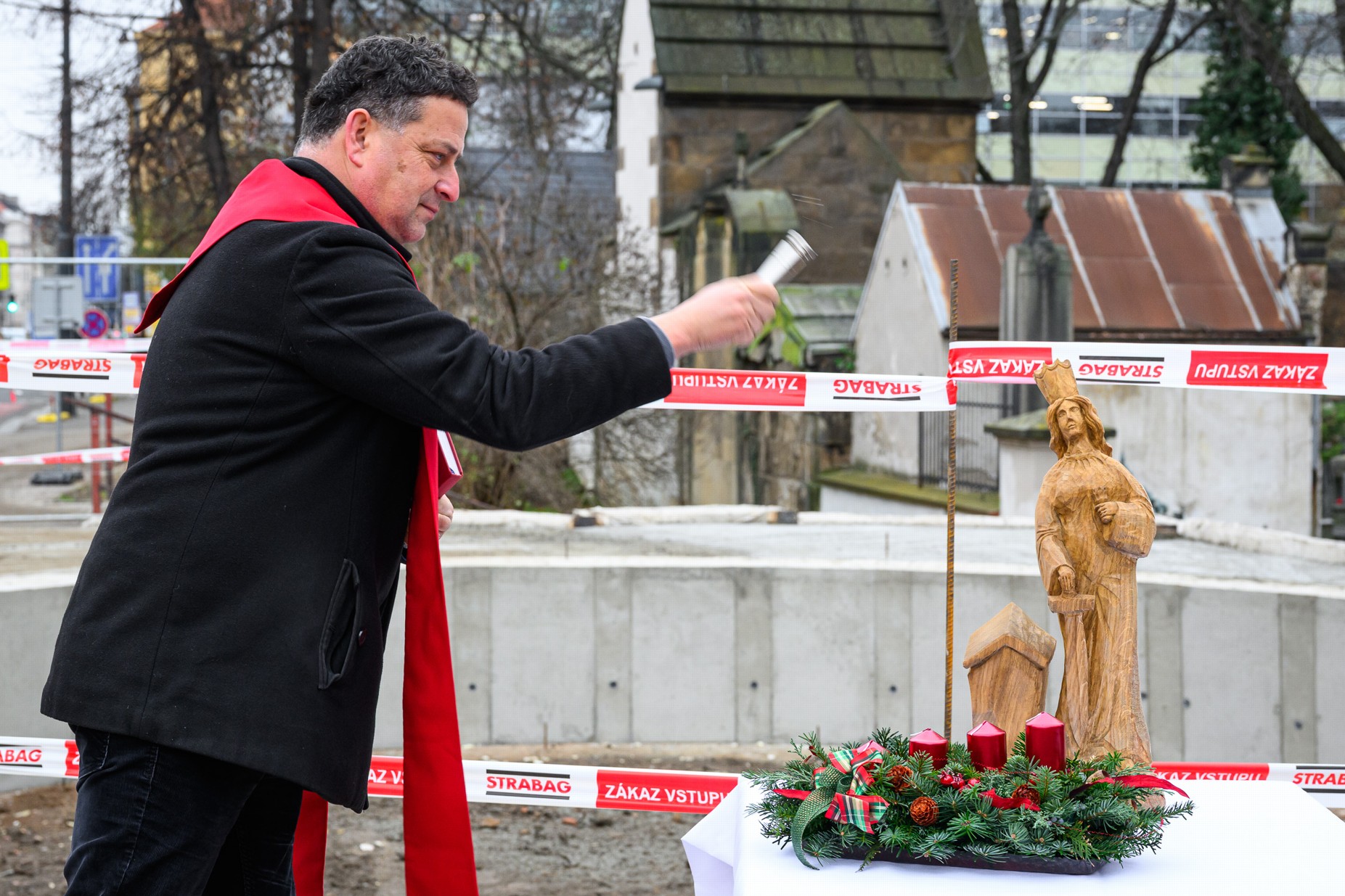 Ve čtvrtek bylo na staveništi symbolicky požehnáno sošce sv. Barbory, která je patronkou horníků a všech stavařů, kteří pracují pod zemí. Ceremonií provedl farář Jan Houkal z nedalekého