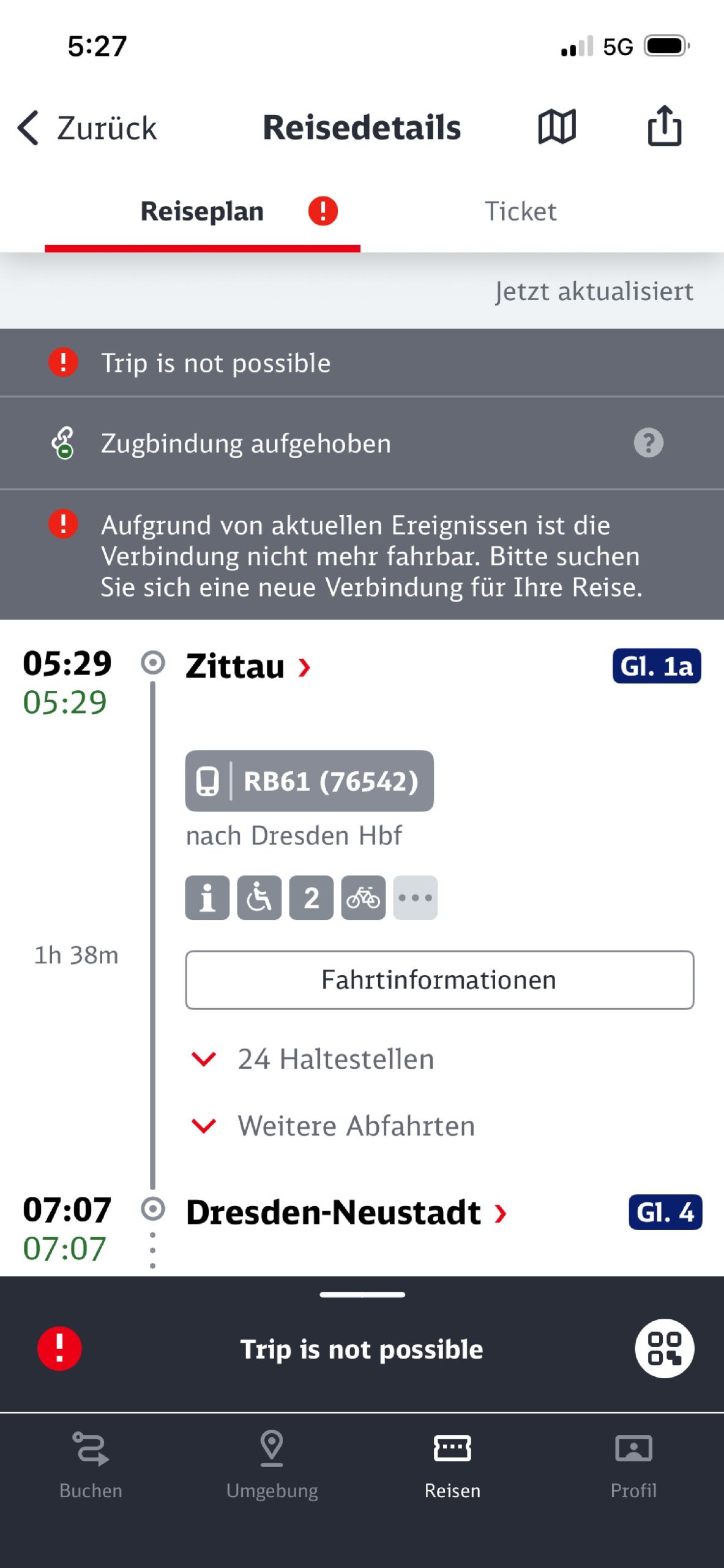 Nakonec se ale ukázalo, že DB snad myslí dopředu. Když v 5 ráno usedáme do vlaku Trilex z Liberce do Žitavy, čeká na mě v e-mailu upozornění, že náš vlak z Drážďan do Frankfurtu prostě nejede. Žádná nabídka alternativního spojení, prostě se starejte.