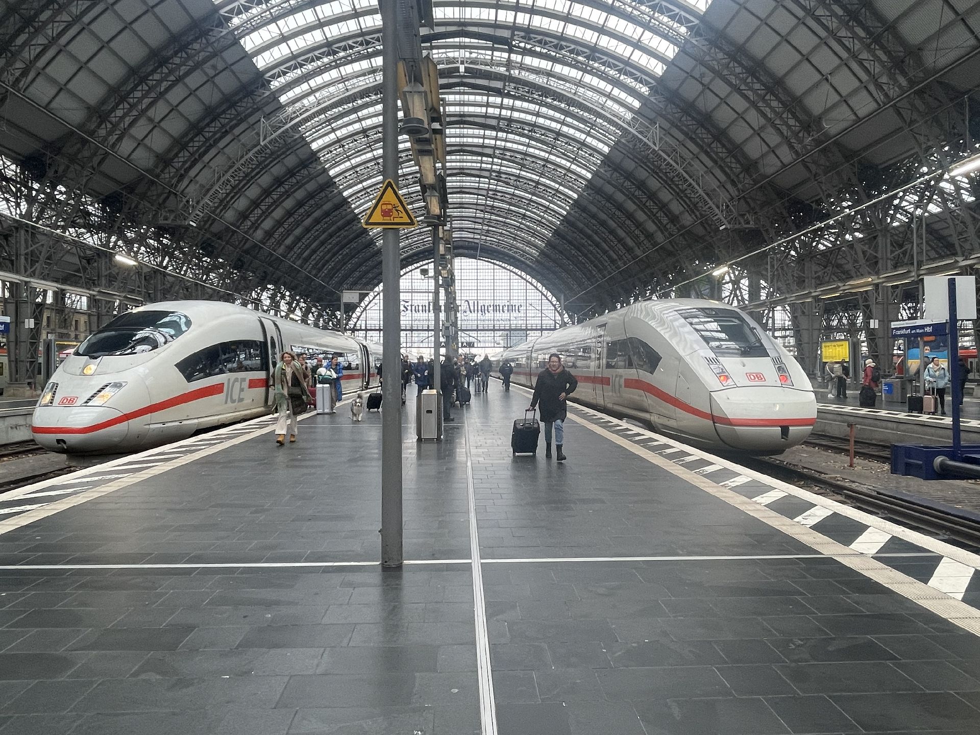 Trať mezi Lipskem a Frankfurtem je vysokorychlostní jen v části z Lipska do Erfurtu, kde vlak může jet až 300 km/h, rychlost se ale zastaví v našem případě na 250 km/h, nejedeme nejrychlejšími jednotkami ICE. Z Erfurtu se vlak už „plouží“ maximálně 160 km/h. Výluky na trati se nekonají. Přijíždíme se zpožděním jen několika minut.