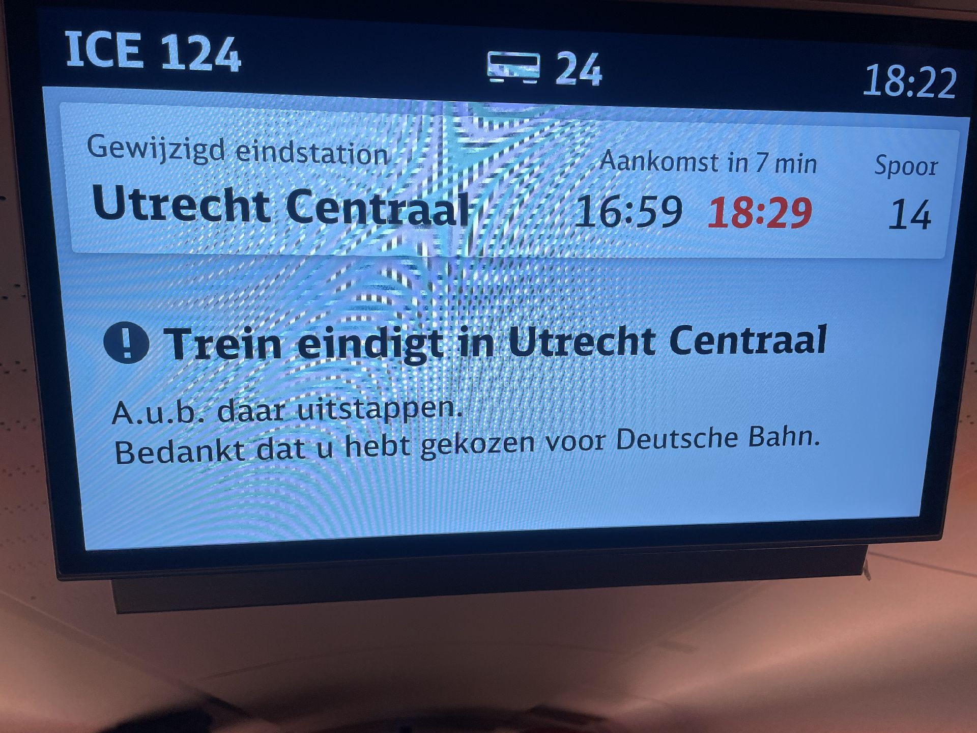 Zpoždění místy narůstá na více než 90 minut. Krátce před Utrechtem navíc vlakový personál oznamuje, že tento spoj mimořádně ukončí svoji jízdu v Utrechu. Čistě provozně lze takovou změnu chápat. Vlak měl mít ještě obrat v Amsterdamu a jet zpět do Frankfurtu, takto zpoždění vyruší. Průvodčí ještě opakovaně vyzývá cestující, aby využili žádost o kompenzaci za zpoždění. Jak jsme dopadli, to zatím netuším.