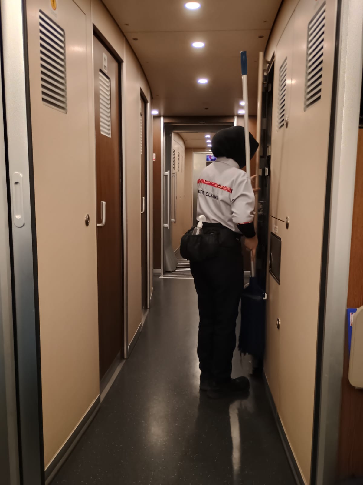 Snad každý vagon má svého zřízence s mopem a čisticími prostředky. Blýskají se okna, blýská se toaleta, blýská se podlaha.