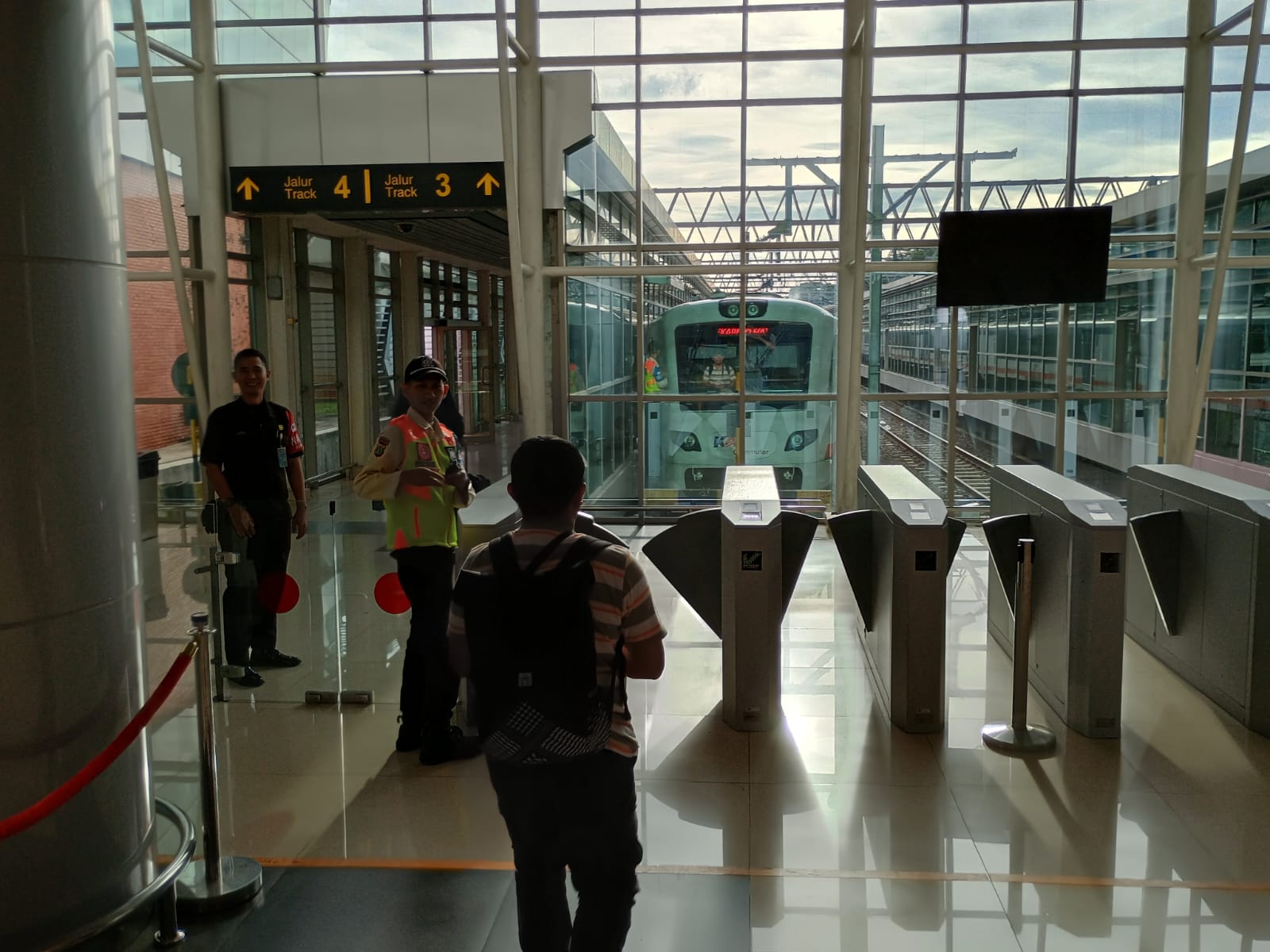 Z letiště do centra Jakarty jede vlak 45 minut, taxík to může zvládnout podobně rychle, jenže nikoli v silniční dopravní špičce, která železnici pochopitelně netrápí. Jízdenka stojí 75 000 rupií, to je zhruba stokoruna. Nádhera. Nastupuje se skrz turniket jako kdysi u nás v metru, platí se bezhotovostně v dotykovém automatu na moderním nádraží, které je s letištěm propojené visutým metrem.