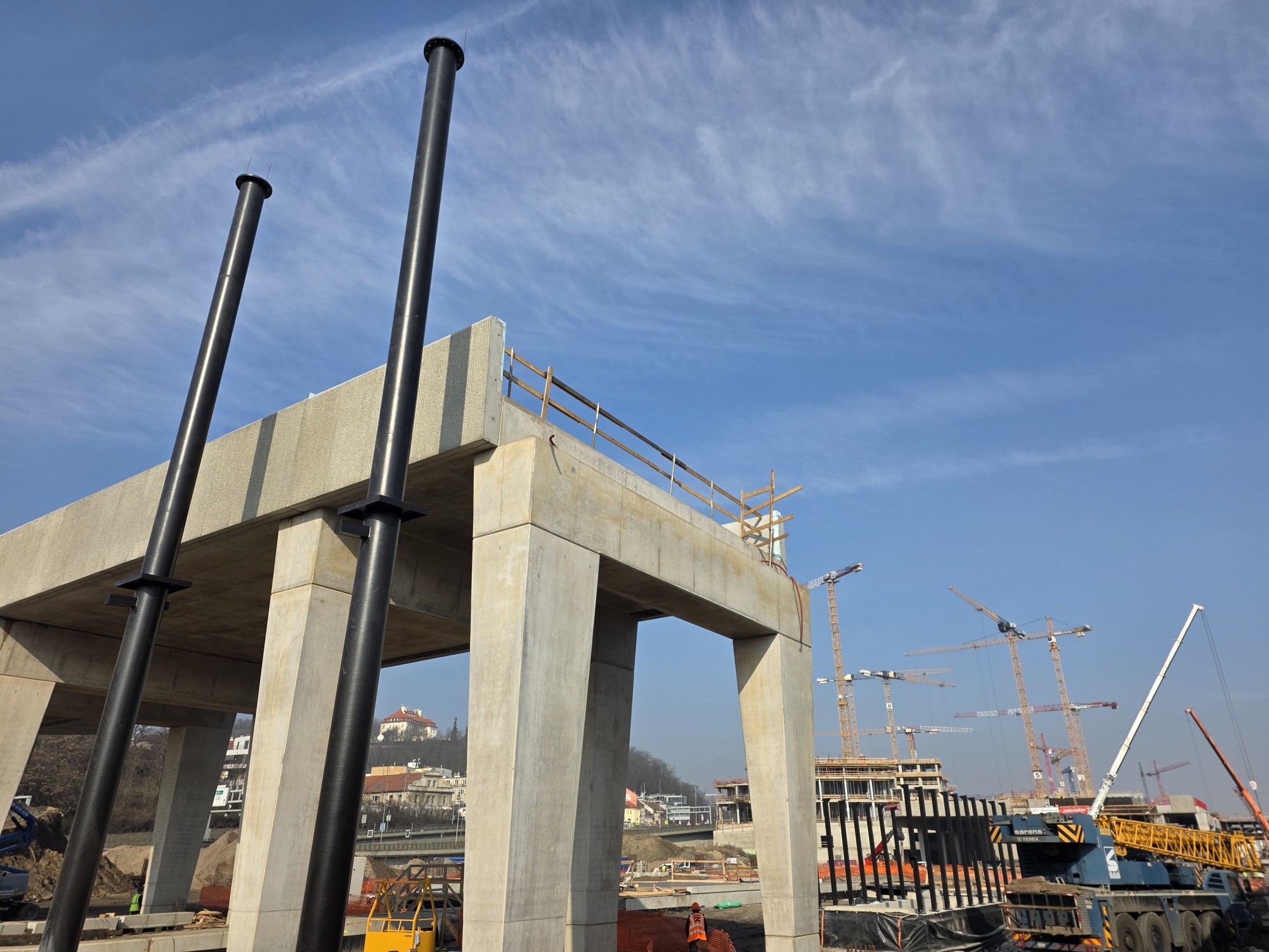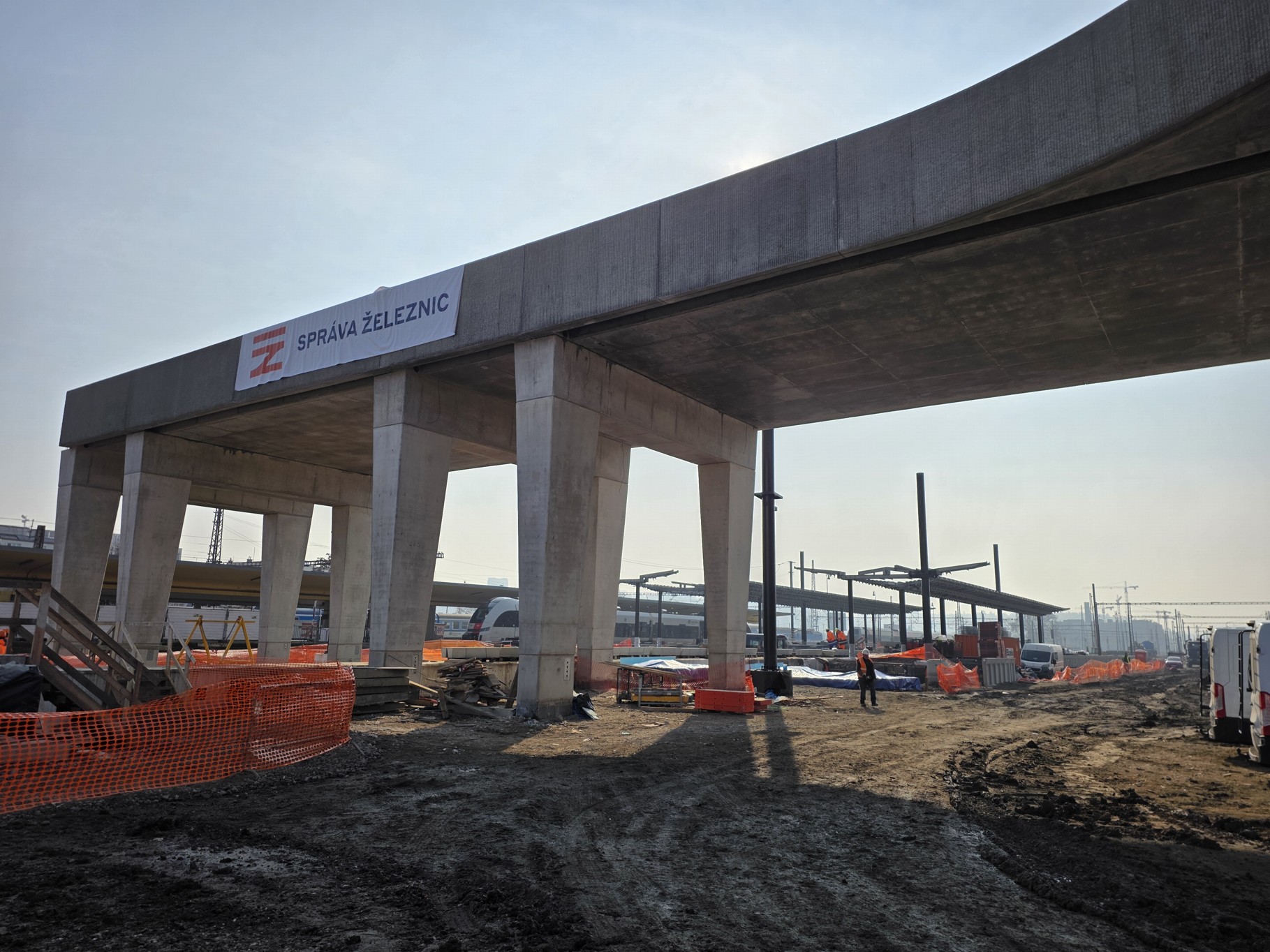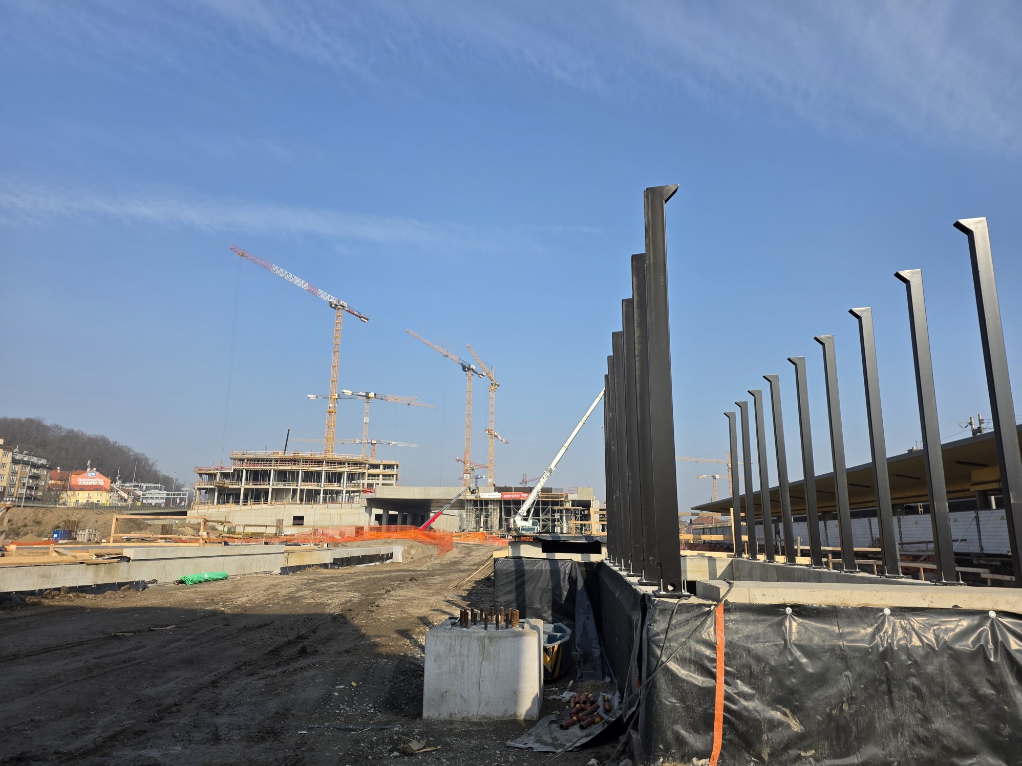 Na staveništi stojí už i čtyři obří černé ocelové sloupy z celkem 40, které budou podpírat autobusové nádraží nad kolejemi. Jde o investici hlavního města, SŽ sloupy a dva mosty buduje v předstihu za peníze Prahy, aby se poté již nemuselo do kolejiště zasahovat.