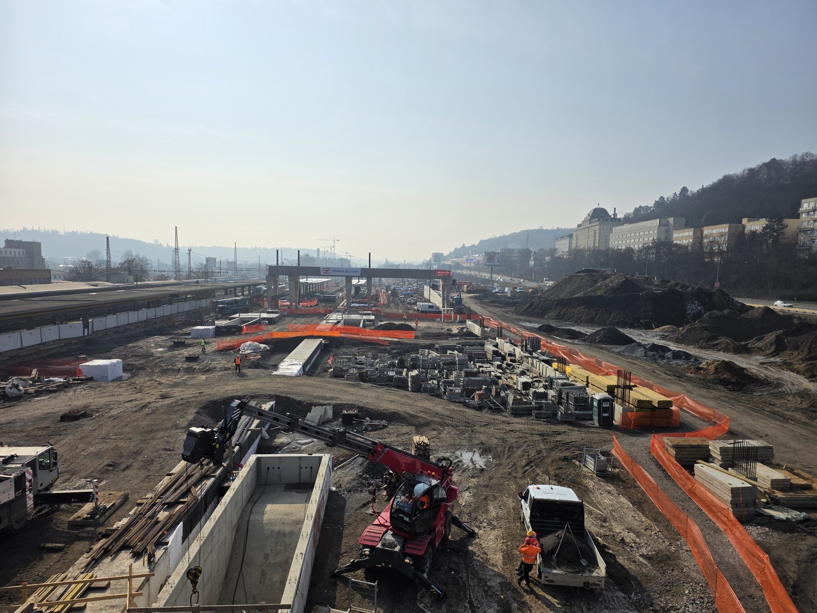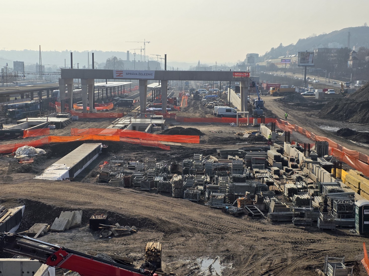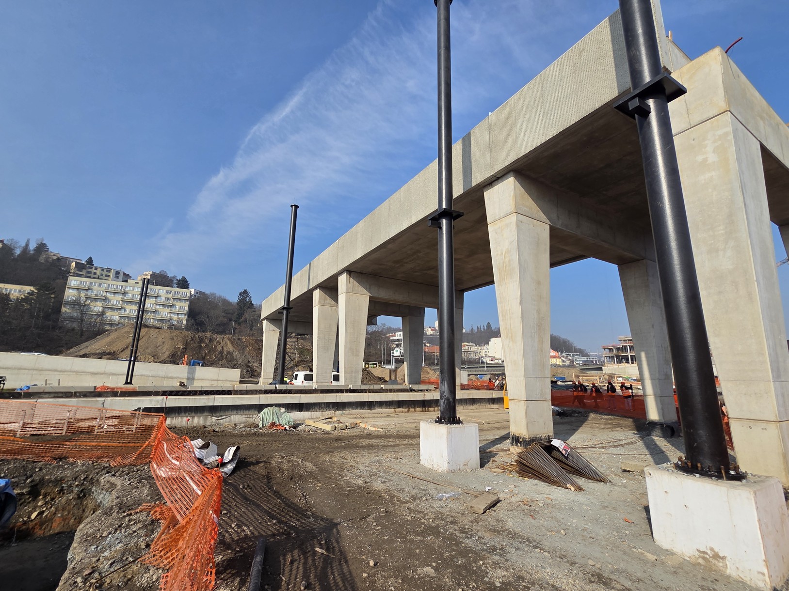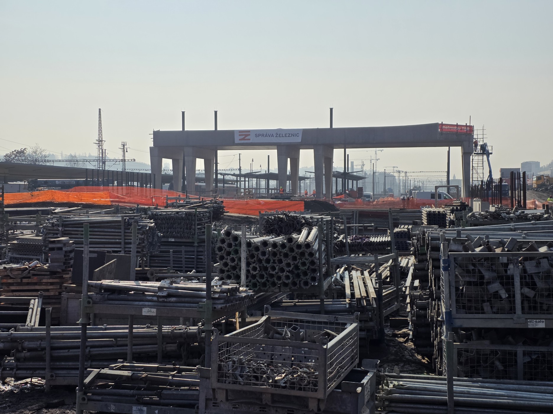 Na staveništi stojí už i čtyři obří černé ocelové sloupy z celkem 40, které budou podpírat autobusové nádraží nad kolejemi. Jde o investici hlavního města, SŽ sloupy a dva mosty buduje v předstihu za peníze Prahy, aby se poté již nemuselo do kolejiště zasahovat.