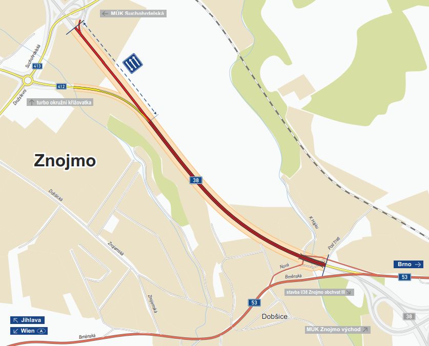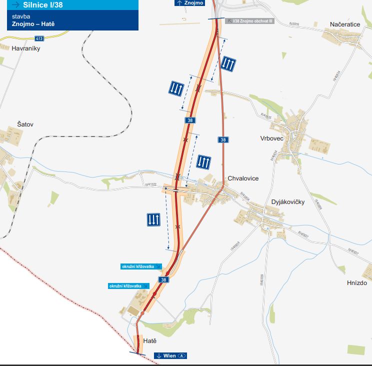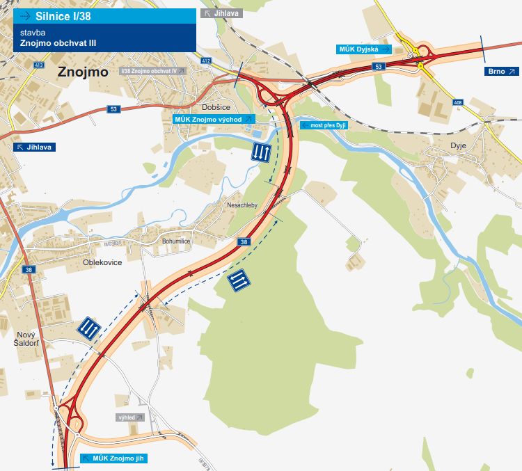 Do takzvaného zjišťovacího řízení poslalo ŘSD dokumentaci ke 3. a 4. stavbě východního obchvatu města a navazující silnice I/38 Znojmo – Hatě, která povede částečně mimo stávající trasu. Jde o celkem 11,4 kilometru nové silnice a necelé dva kilometry upravené silnice I/53.