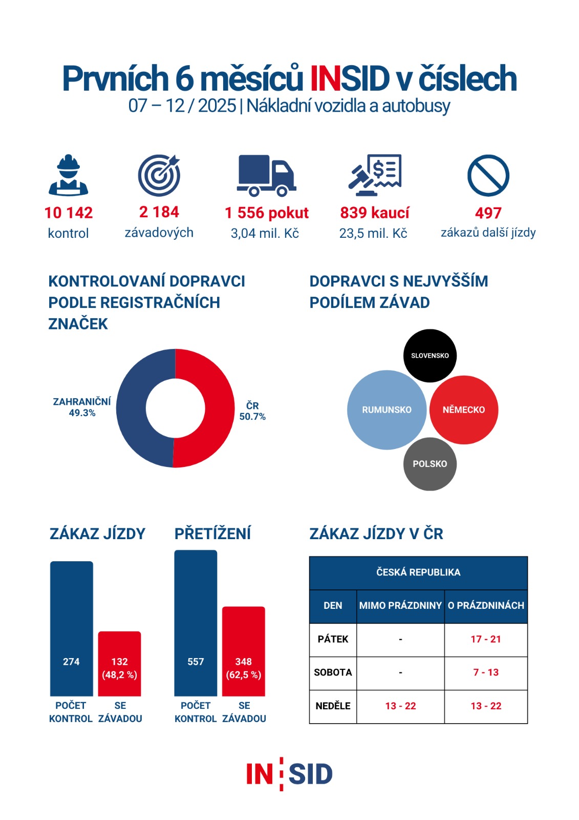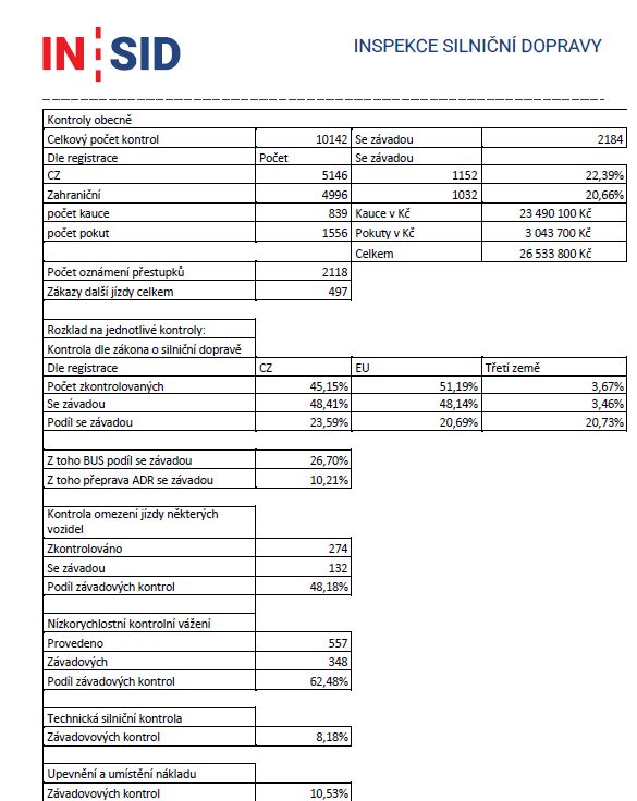 Nové jednotky Inspekce silniční dopravy (INSID) za sebou mají půlrok aktivní činnosti a první čísla naznačují, že se inspektoři začínají státu vyplácet. Od loňského prvního července na silnicích provedli 10 142 kontrol nákladních vozidel, dodávek a autobusů. Ve 2 134 případech (tedy ve 21 procentech) zjistili porušení předpisů za něž uložili pokuty ve výši 3,043 milionu korun a k tomu ještě kauce pro zahraniční řidiče za 23,49 milionu korun. Do veřejných rozpočtů tak přispěli částkou převyšující 26,5 milionu korun.