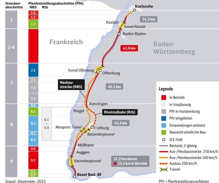 Vlaky po modernizované trati mohou až 250 km/h, aktuálně je tak mezi Karlsruhe a Basilejí již 67 kilometrů s touto traťovou rychlostí. Původně se v tomto úseku jezdilo maximálně 160 km/h. Už příští rok dojde k otevření dalších 16 kilometrů včetně Rastattského tunelu.
