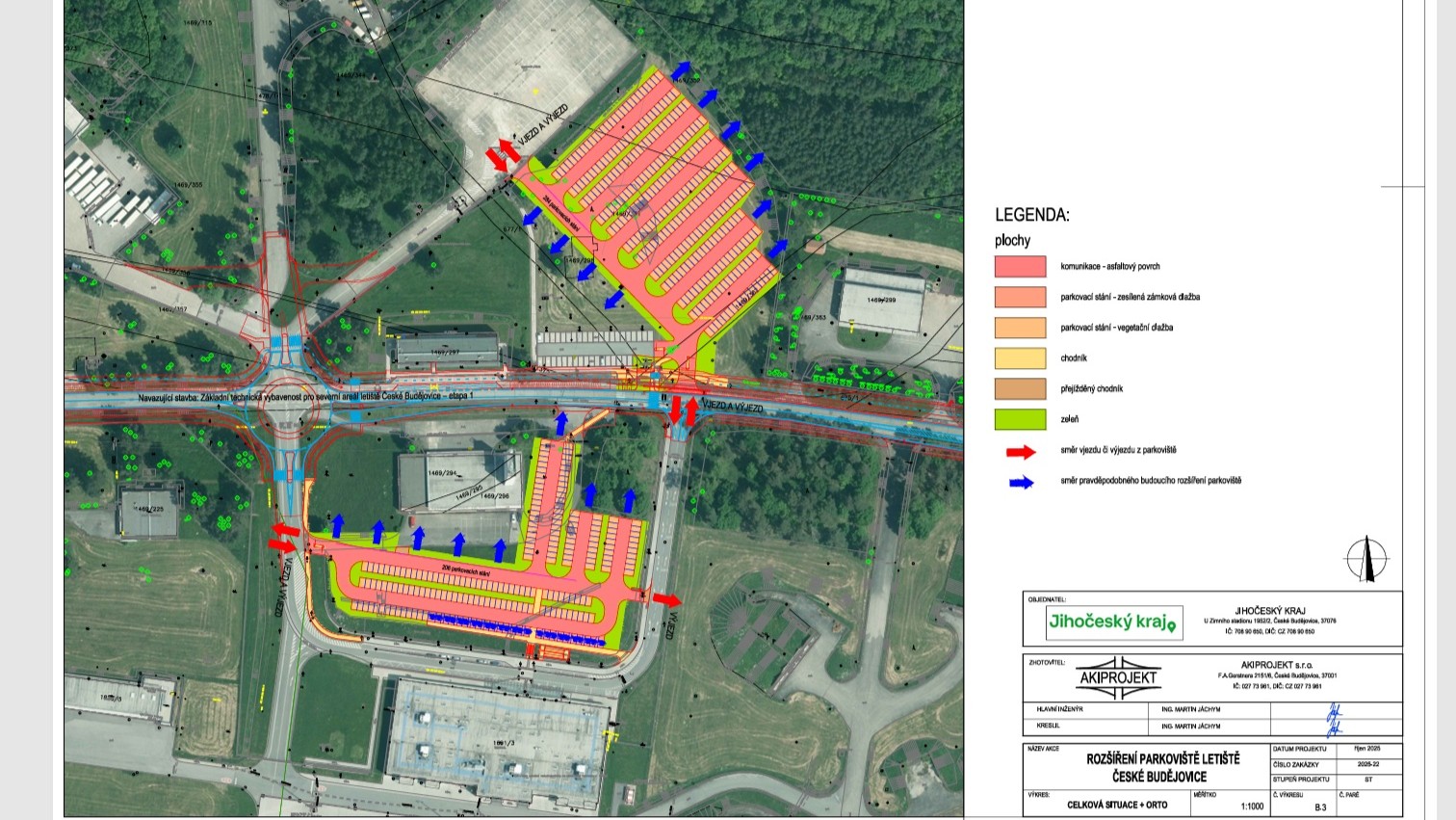 „Předmětem stavby je rozšíření parkovacích kapacit v areálu Letiště České Budějovice, které je rozděleno do dvou samostatných, funkčně propojených částí – jižního a severního parkoviště. Jižní parkoviště bude nově vybudováno mezi letištním terminálem a hasičskou stanicí. Severní část rozšiřuje stávající parkoviště o nové plochy,“ uvádí objednatel v požadavcích zakázky.