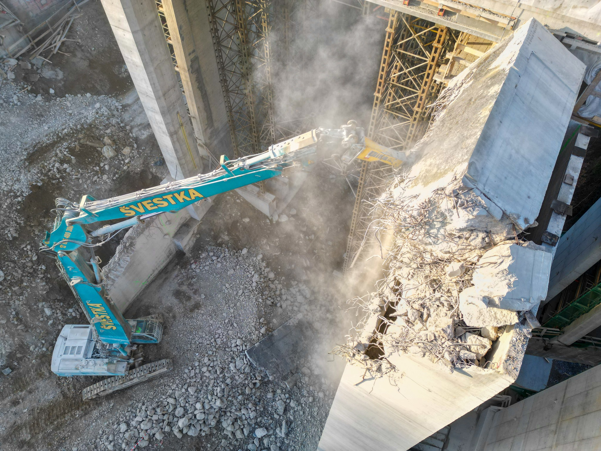 Na dálnici D1 pokračují demoliční práce na polovině původní konstrukce mostu Šmejkalka. Po snesení odřezaných betonovách bloků jeřáby se do mostu zakousla pásová rypadla typu Catterpillar 5080 či Liebherr R954C. Informovala o tom společnost Pavel Švestka, která má systematickou demolici jednotlivých pilířů mostu a následnou recyklaci materiálu na starosti.