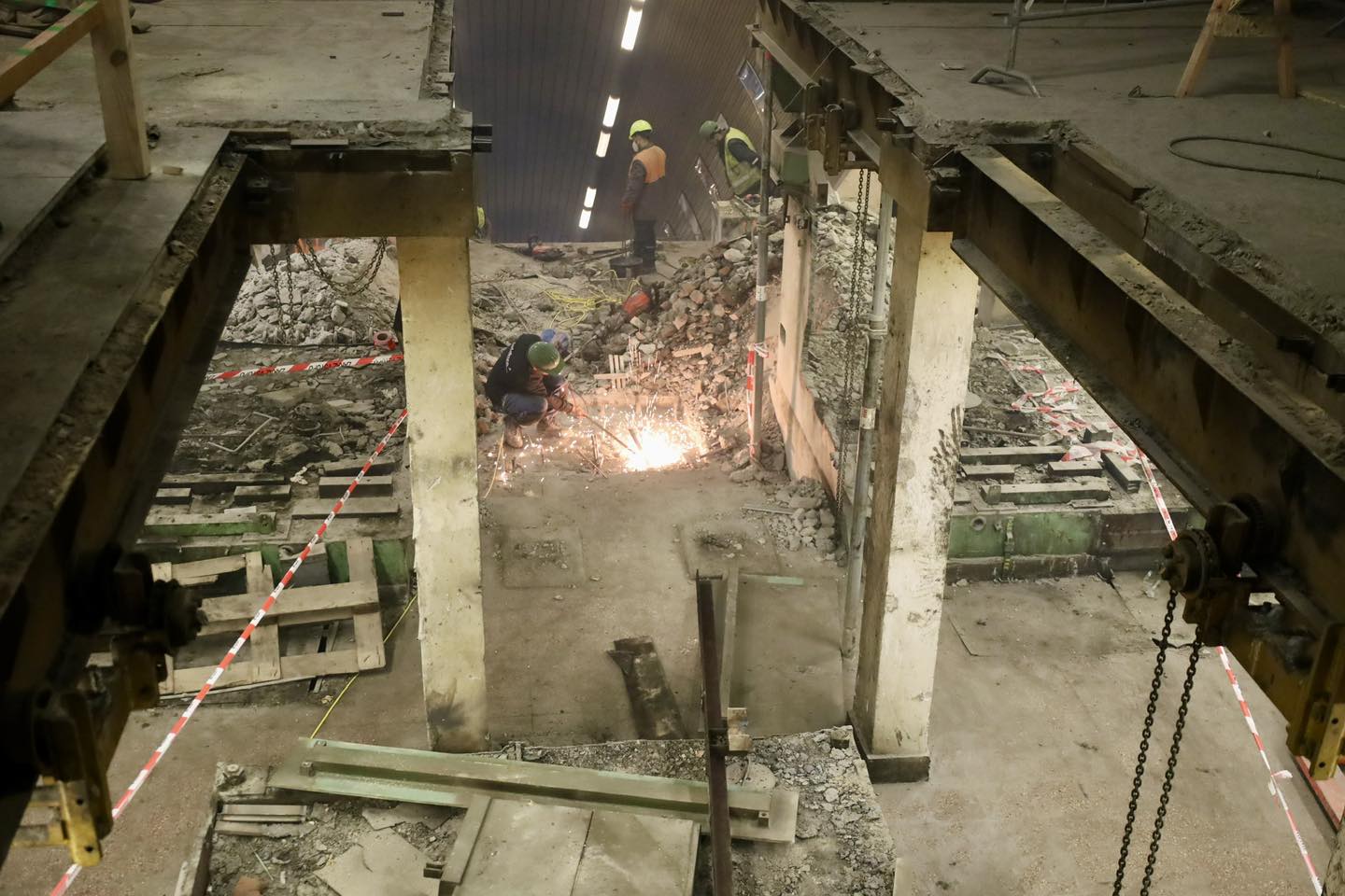 V celé stanici pokračují demontáže všech podhledových konstrukcí, aby mohli stavbaři odkrýt nosné konstrukce a na základě skutečně zastiženého stavu definovat rozsah sanačních prací či výměn jednotlivých částí konstrukcí.