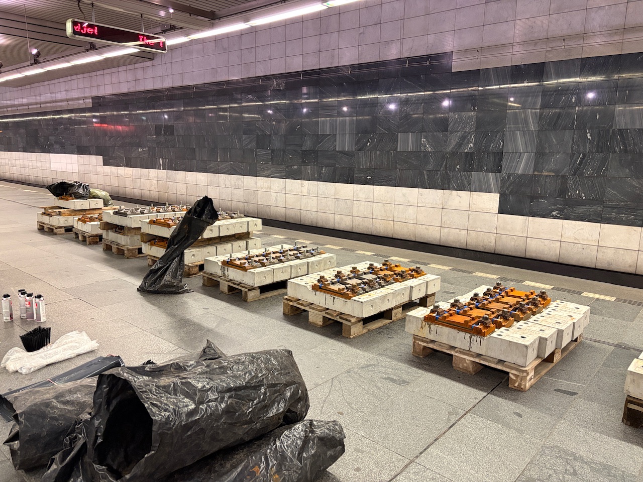 Že nejde o práci pro každého, je jasné dle množství navezeného materiálu hned na první pohled. Jde o tvrdou manuální práci, kterou musejí zaměstnanci DPP udělat v krátkém časovém úseku. Aby nepoškodili povrch nástupiště, kam si nástroje a materiál odkládají, zakryjí jej dlouhým kobercem.
