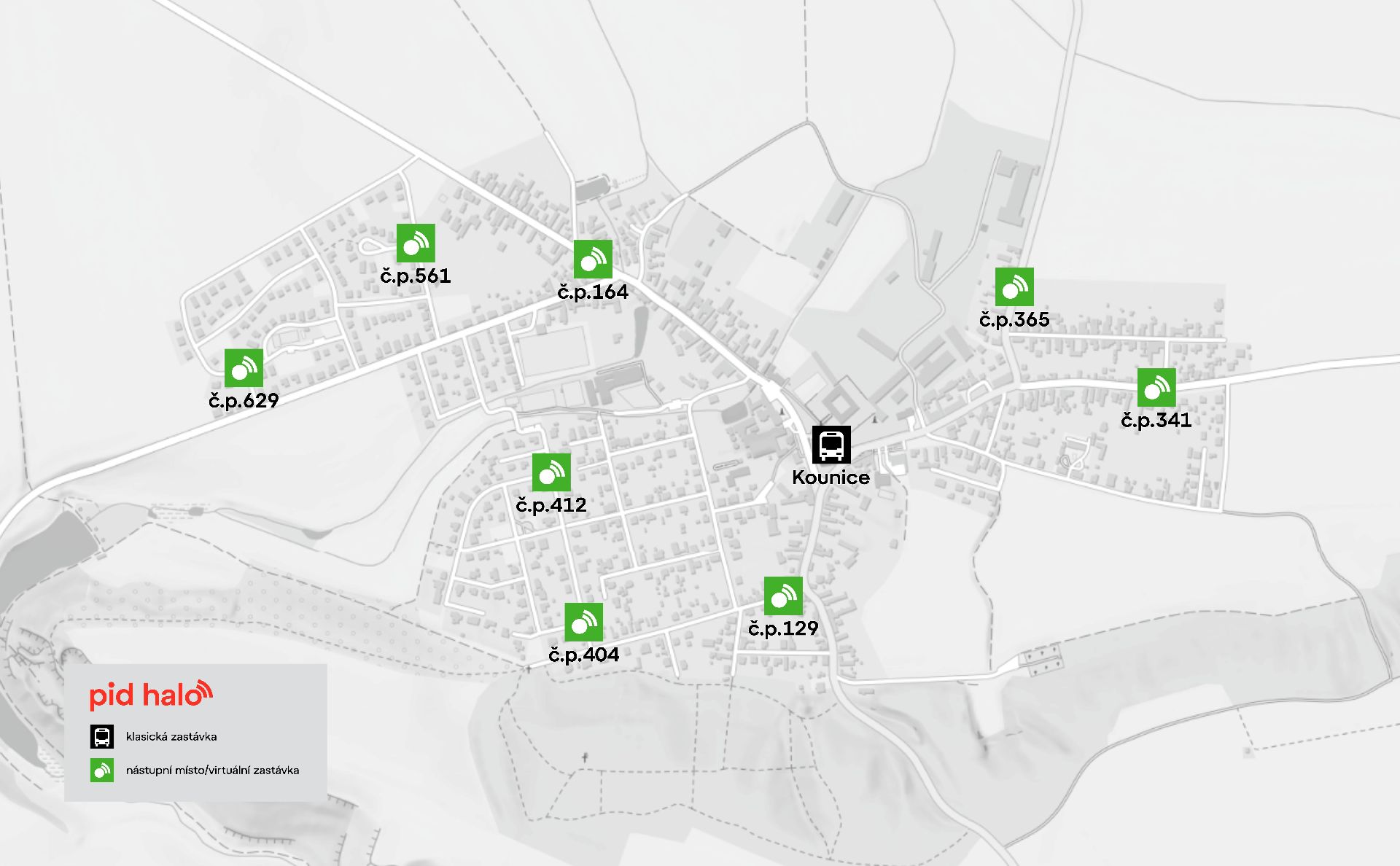 Celkem osm míst, která nejsou na ulicích nijak označena, vzniklo v obci Kounice. Jako zastávky jsou místa viditelná jen v aplikaci PID Lítačka a na mapách. Nejsou tedy opatřena sloupkem či přístřeškem. „Smysl je jednoduchý: dostat dopravu blíž k lidem, hlavně do nových obytných lokalit nebo okrajových částí obcí, kde se dnes klasická autobusová zastávka nevyplatí nebo ani nedá postavit,“ řekl mluvčí PID Filip Drápal.