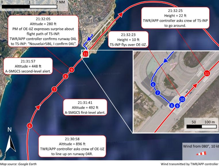 Piloti tuniského letadla na poslední chvíli přerušili přistávání a jen díky tomu nedošlo ke srážce. Podle dat z výškoměru A320 Nouvelairu během sekundy kleslo letadlo z 39 na 10 stop, následně po reakci pilotů další sekundu na 24 stop. Těsně tak přelétl nad stojícím airbusem na dráze. Piloti easyJetu se následně vrátili zpět k terminálu a odmítli pokračovat, let byl zrušen.