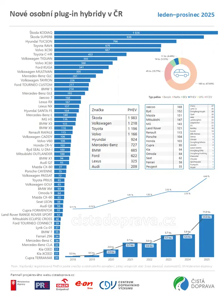 Na konci roku bylo v tuzemsku v provozu více než 36 tisíc osobních plug-in hybridů (PHEV). V průběhu roku 2025 se jich nově zaregistrovalo 11 033. Tržní podíl tohoto segmentu tak dosáhl 4,4 %, zatímco v roce 2024 činil 2,6 %.
