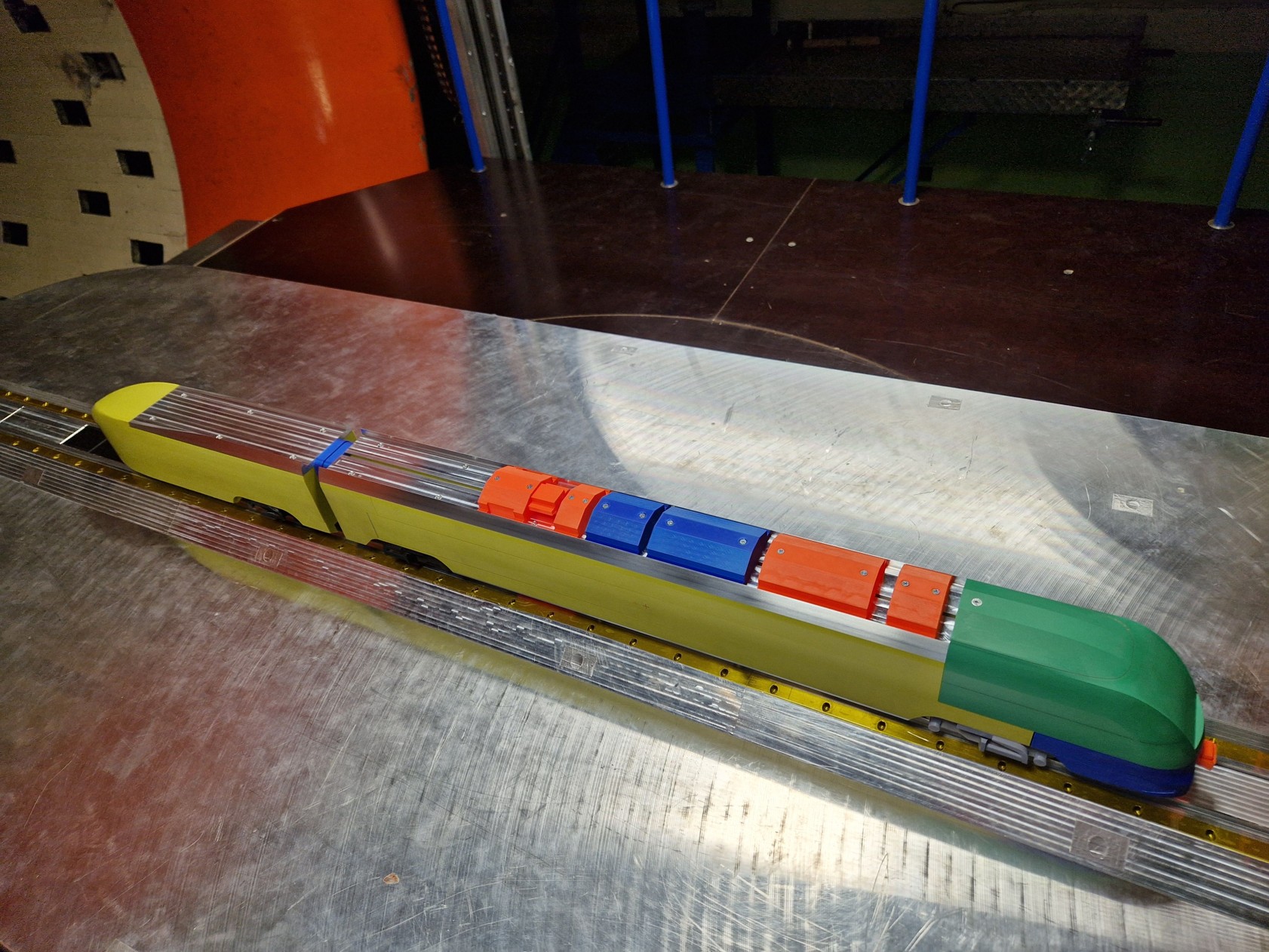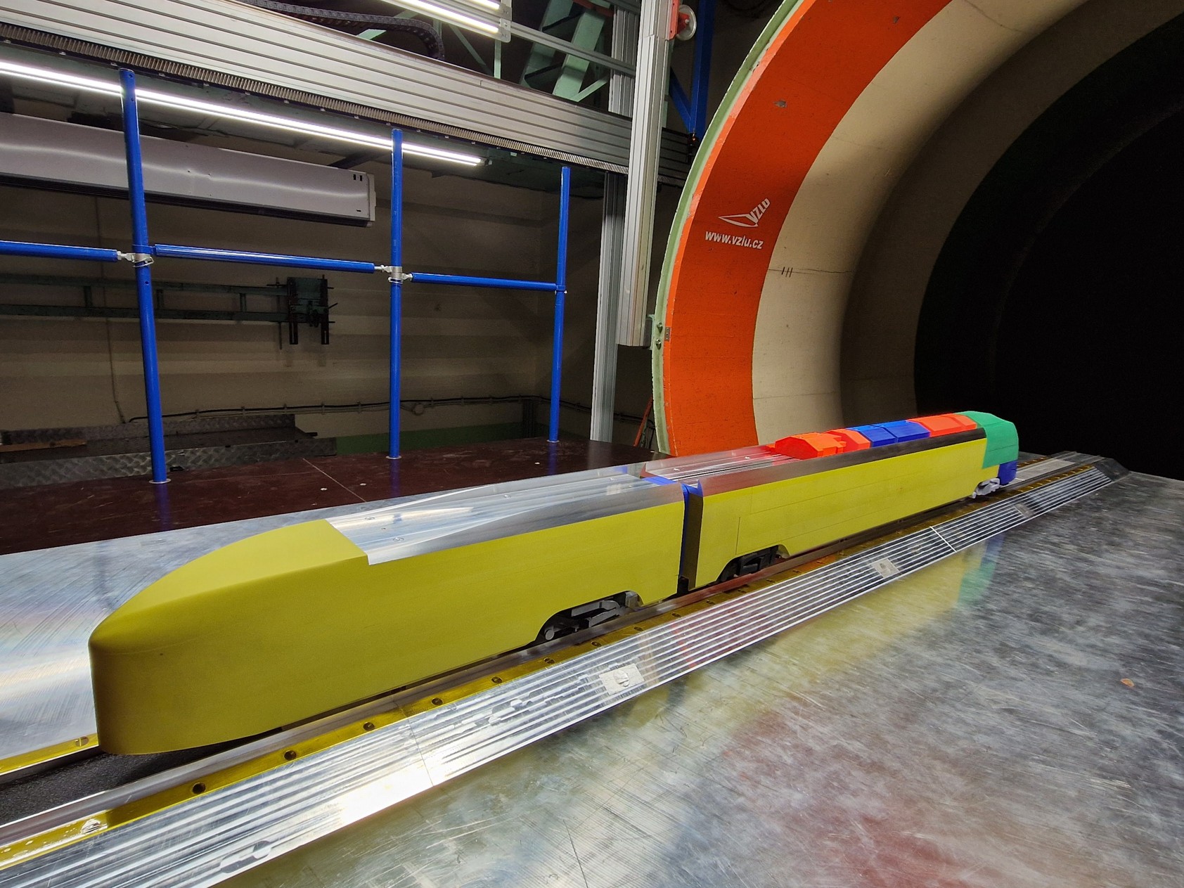 Model čelního vozu nové jednotky je umístěn na speciální natáčecí desce simulující násep kolejového tělesa. Testuje se při rychlosti proudění vzduchu až 75 m/s (270 km/h). Celkem se uskuteční třicet různých zkoušek, jejichž výsledky bude výrobce následně vyhodnocovat a použije je pro certifikační procesy.