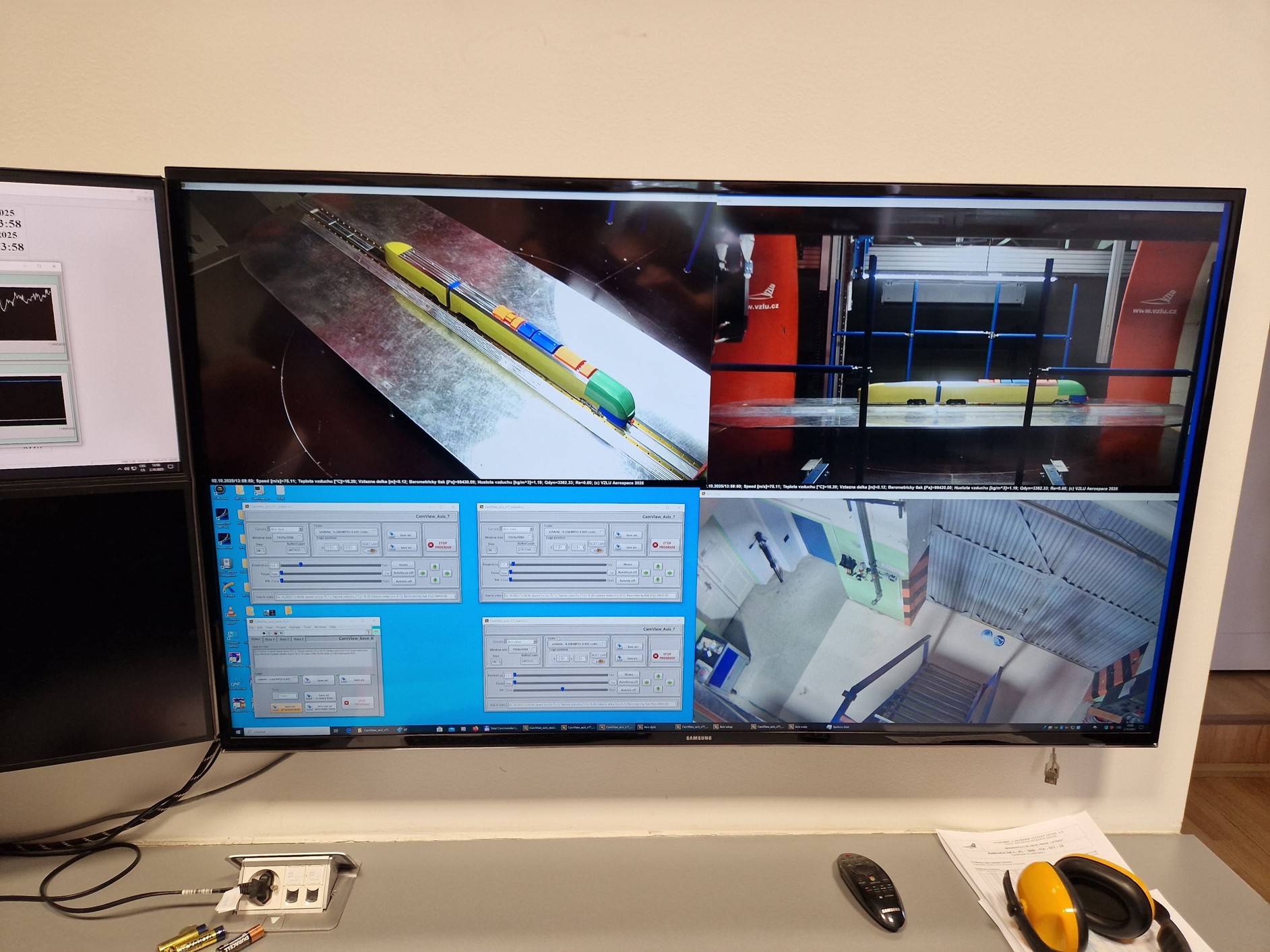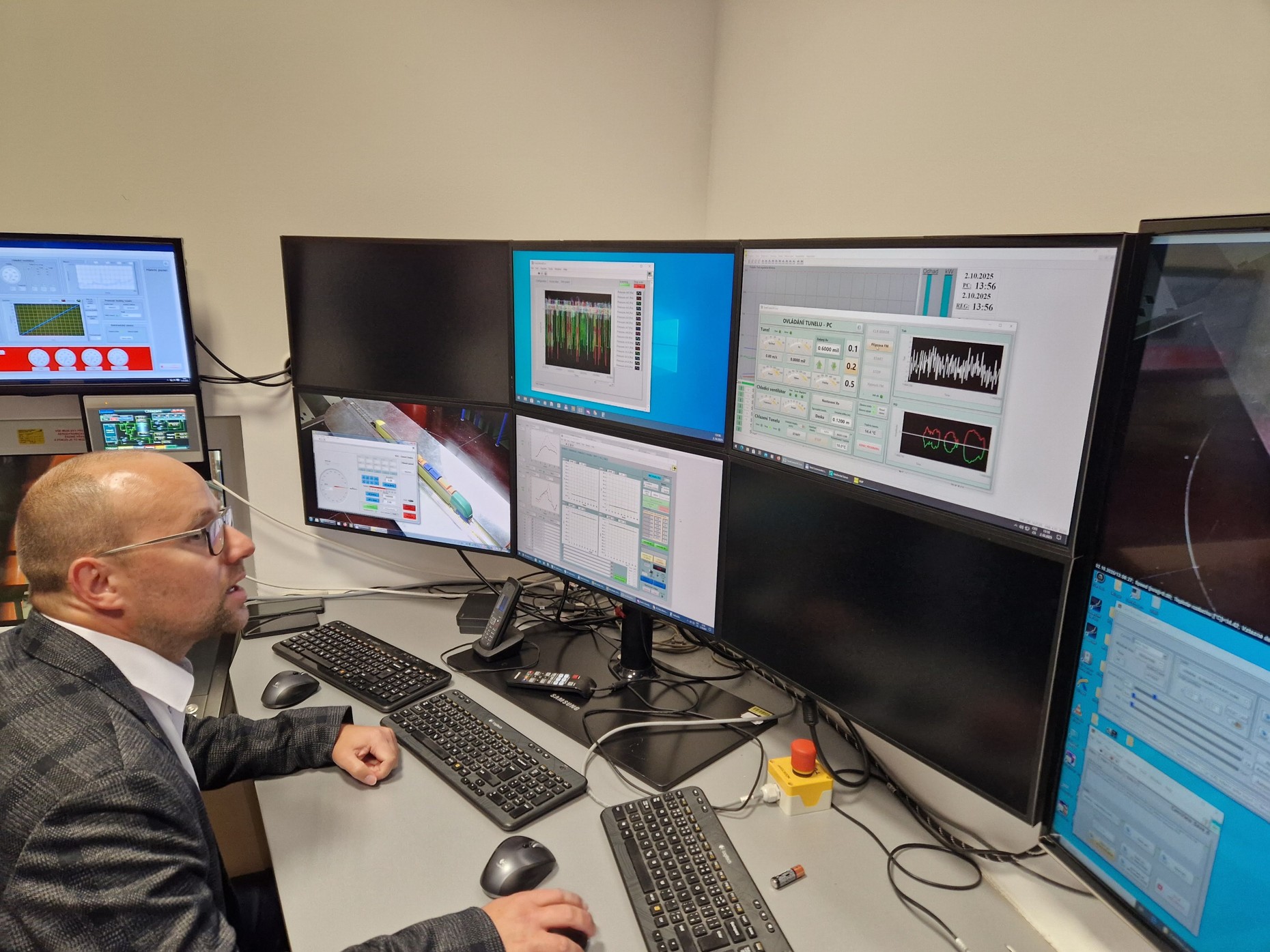 Přesouváme se do velína tunelu, kde Jan Červinka zapíná testovací turbínu na rychlost 75 metrů za sekundu. Podlaha se začíná otřásat, rychlost narůstá. Zatímco hluk z tunelu za sklem není nijak velký, vibrace jsou citelné. Obsluha pozorně sleduje naměřené hodnoty.