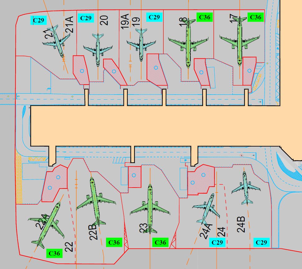 Ve výsledku bude mít sektor C1 celkem čtyři stání pro letadla kategorie C36 a sektor C2 celkem pět stání pro letadla kategorie C36. To je celkem devět stání pro stroje s rozpětím křídel 36 metrů oproti původním pěti stáním.