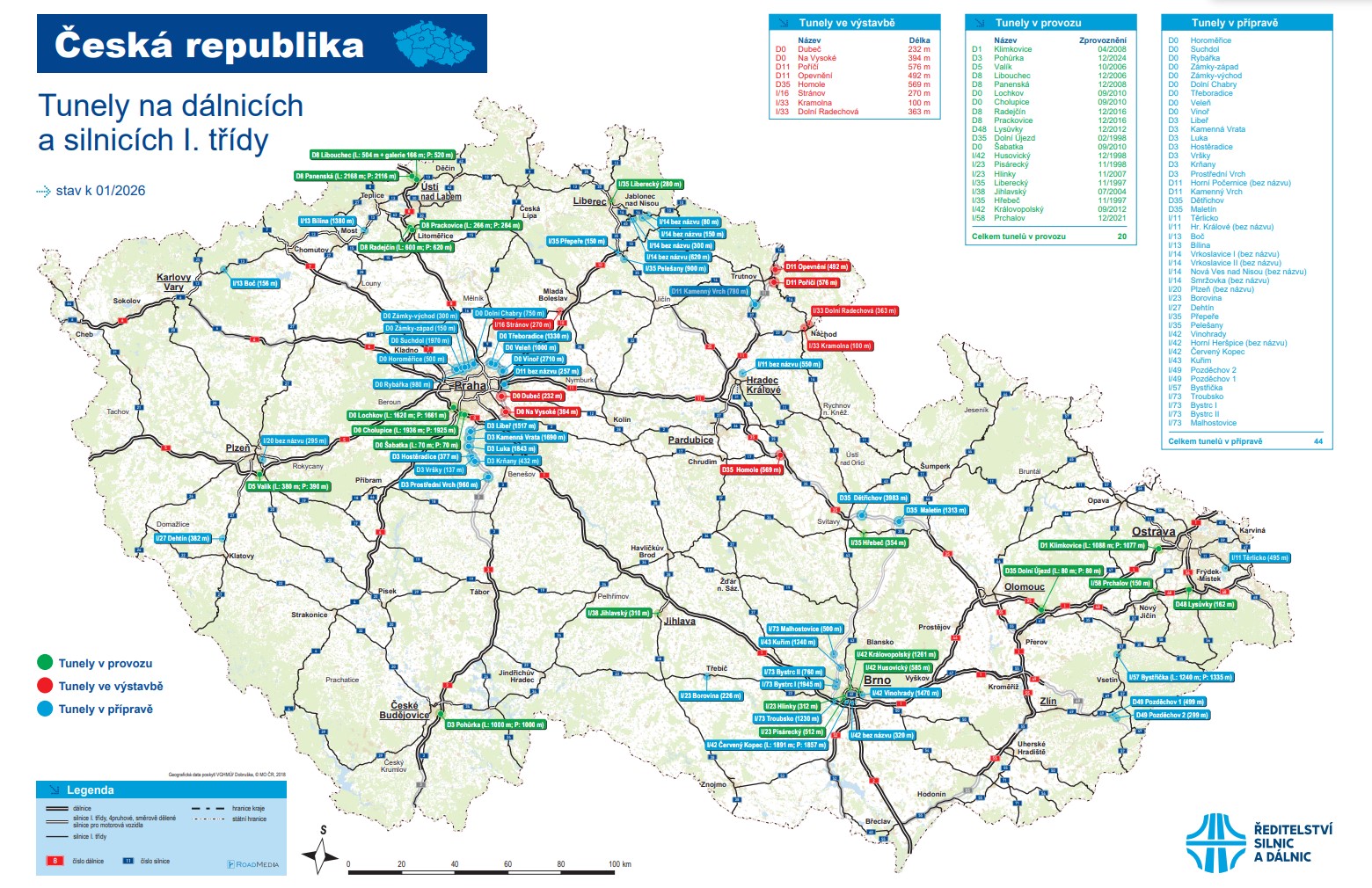 Zatímco nyní provozuje ŘSD na českých dálnicích a silnicích I. tříd 20 tunelů, v následujících letech budou rychle přibývat další. Až bude základní dálniční síť dokončená, mělo by jich být 68, tedy téměř čtyřnásobek.