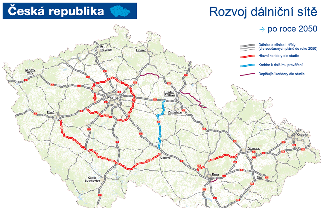 Mapa rozvoje dálniční sítě po roce 2050. Zdroj: Ministerstvo dopravyPlánované dálnice - kapacitní komunikace k roku 2050. Zdroj: ŘSDPlánované dálnice - kapacitní komunikace k roku 2050. Zdroj: ŘSD