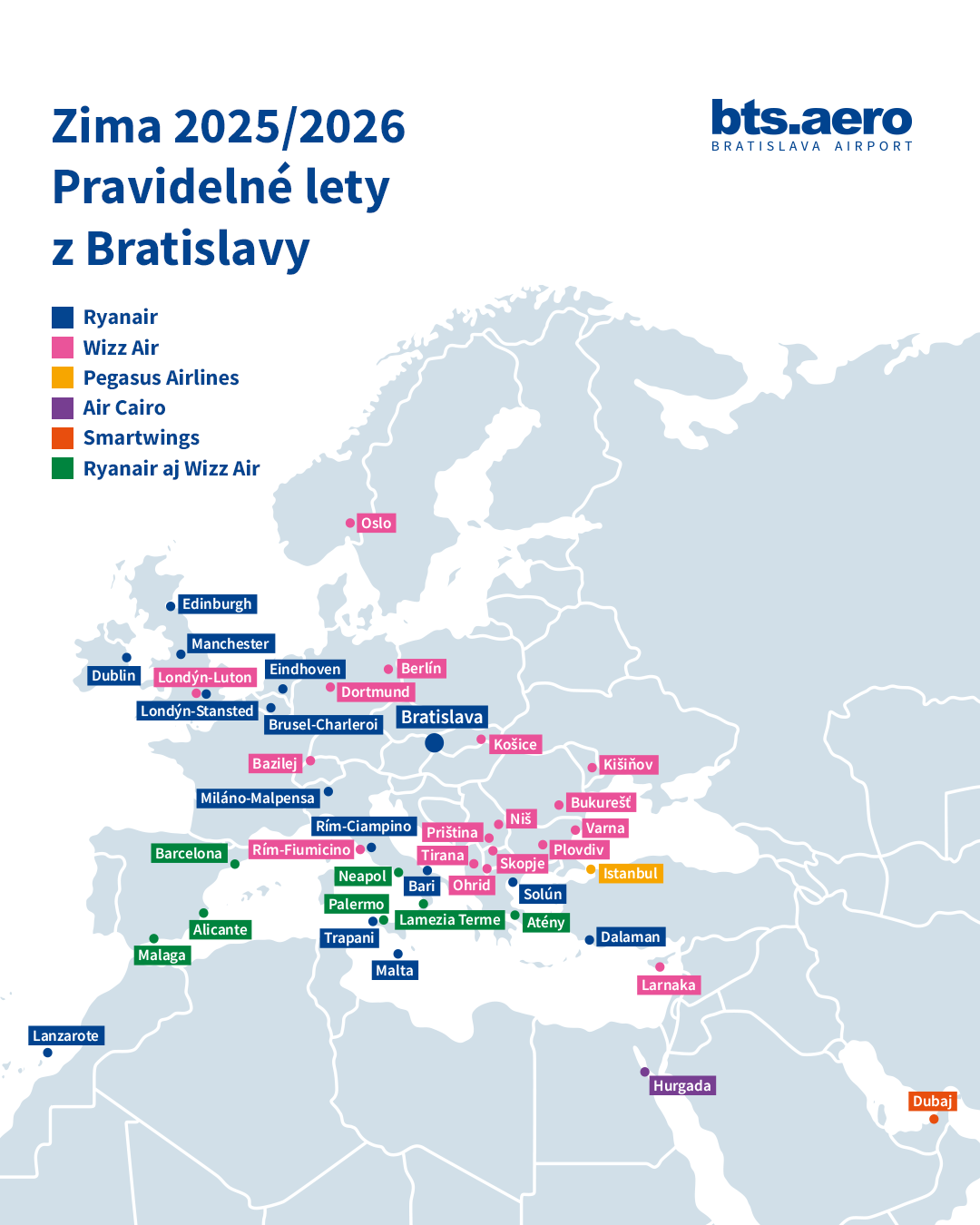Pravidelné lety z Bratislavy bude během zimy provozovat pět leteckých dopravců – Wizz Air, Ryanair, Air Cairo, Pegasus Airlines a Smartwings. Nejvíce, celkem 27, jich zajistí Wizz Air. Konkurenční Ryanair nabídne v „bitvě o Bratislavu“ 21 destinací. Dohromady letiště počítá se 49 pravidelnými linkami.
