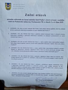 Sedm otázek položených v místním referendu Prahy 1 začínalo vždy souslovím „souhlasíte s tím?“ a velká většina započítaných odpovědí byla kladná. Účast byla dostatečná a u všech otázek je výsledek závazný.