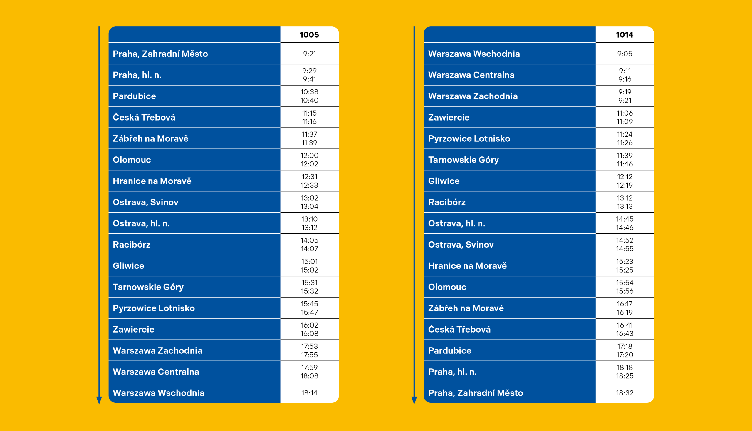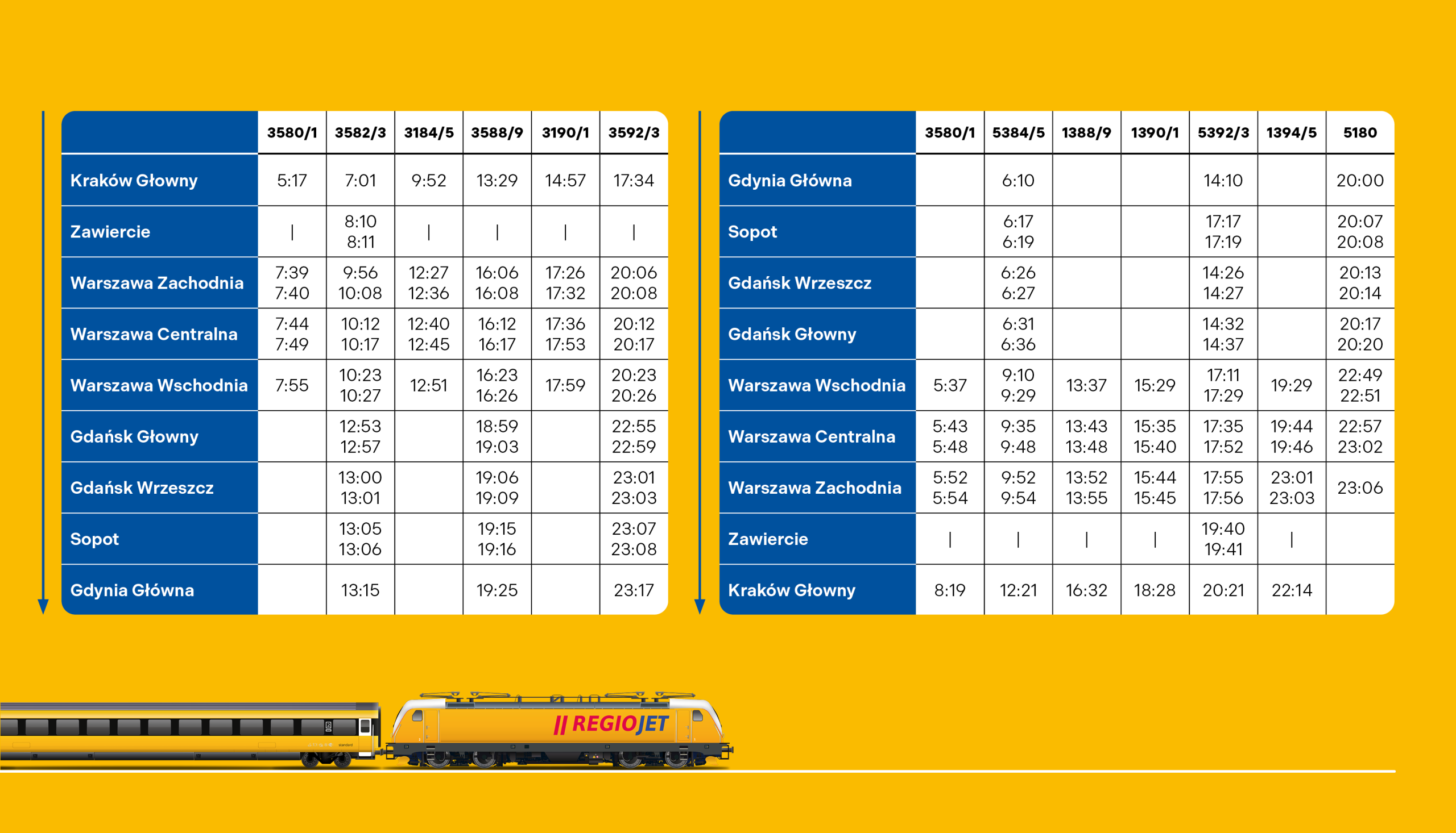 Aktuálně RegioJet počítá od 14. prosince s vypravováním 6,5 páru spojů mezi Varšavou a Krakovem, z nichž tři pojedou až do Gdyně. Jeden pojede delší trasou přes Zawiercie. Z Varšavy do Krakova pojede o jeden vlak více než z Krakova do Varšavy. Na trati Varšava-Ostrava-Praha má jezdit jeden pár spojů denně.