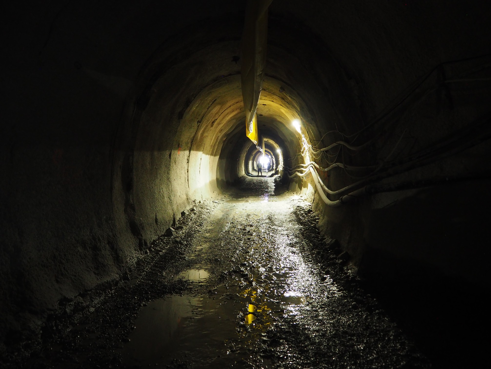 Míjíme místo, kde se štola rozšiřuje, jde o první výhybnu pro techniku, celkem jich zde vznikne patnáct, zatím jsou vyraženy tři. Jsme 25 metrů pod povrchem, na jiných místech bude nadloží až o mocnosti 32 metrů.