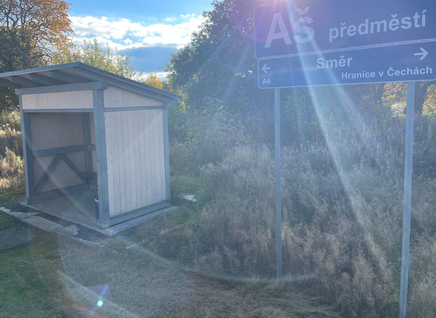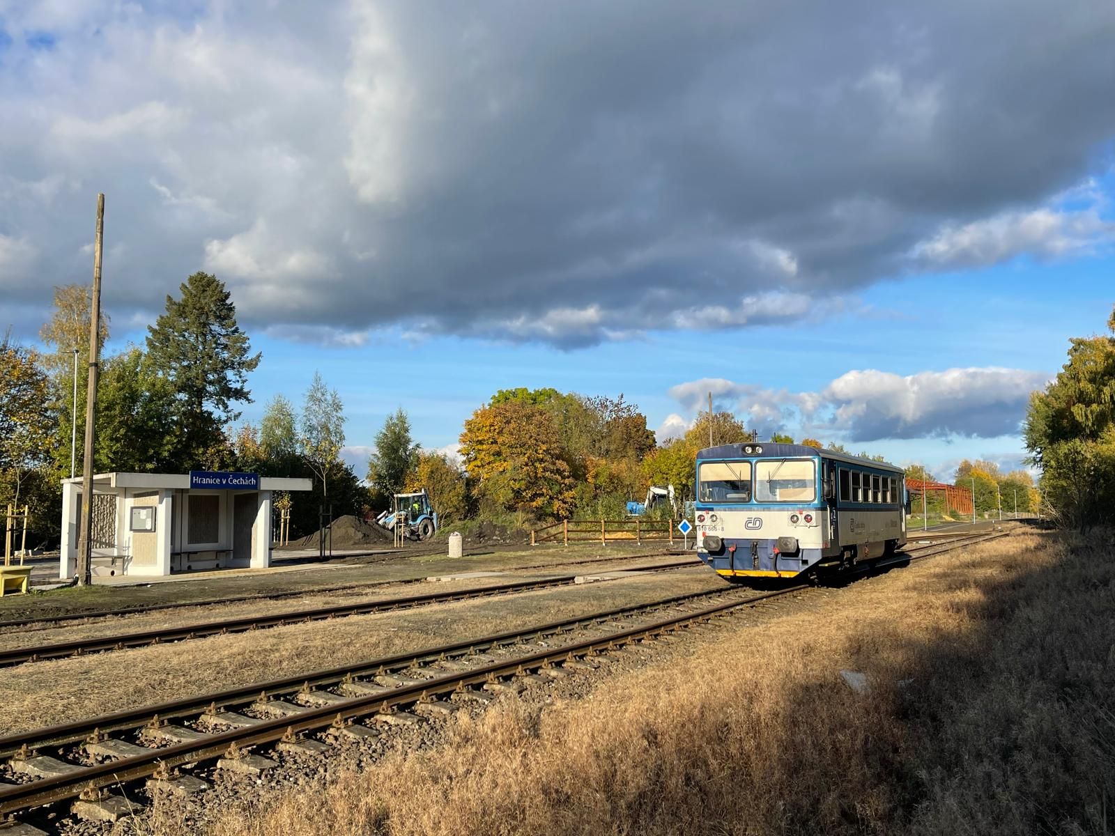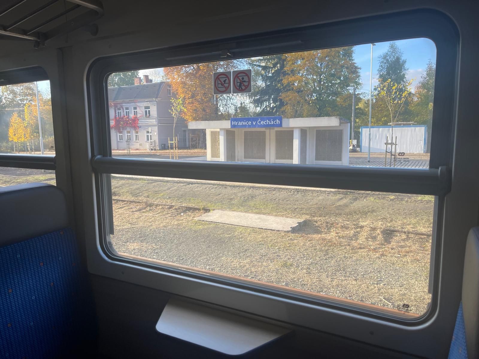Za okny je krásný podzim. Svítí slunce, barví se stromy a já mám pocit, že jsem na konci světa. Trať je tu od Správy železnic krásně udržovaná, prosekaná a na téměř zapomenutých zastávkách jsou typické čekárny, které byste našli i na dalších místech Karlovarského kraje. Nejedeme nijak rychle, na některých přejezdech je desítka nebo patnáctka a v lesních úsecích jsou z vlaku krásně vidět houby. Stačilo by zastavit a nasbírat si je. U zastávky Studánka se na přejezdu setkáváme s autobusem. Mikrobus z Aše do Hranic víceméně kopíruje trasu vlaku. A oba jedou z Aše v téměř shodný čas. Říkám si, jestli tohle není důvod, proč naším vlakem jedu sám.