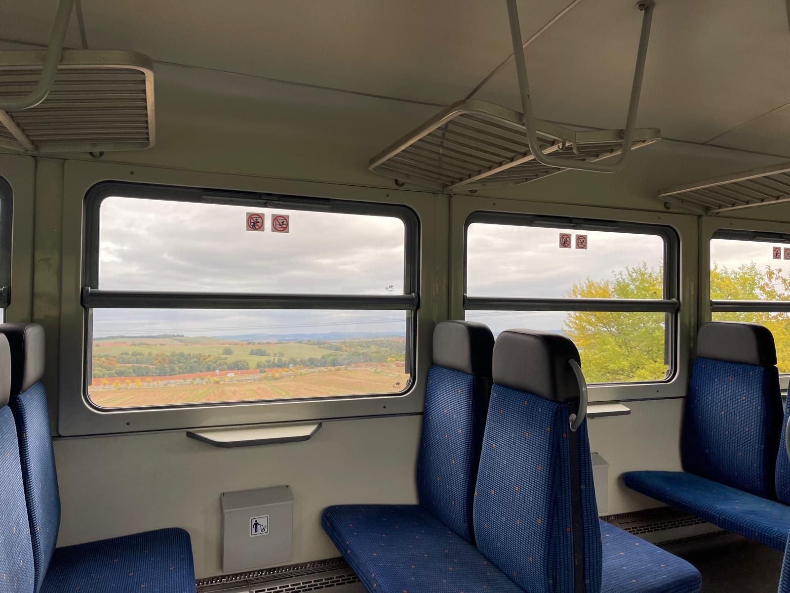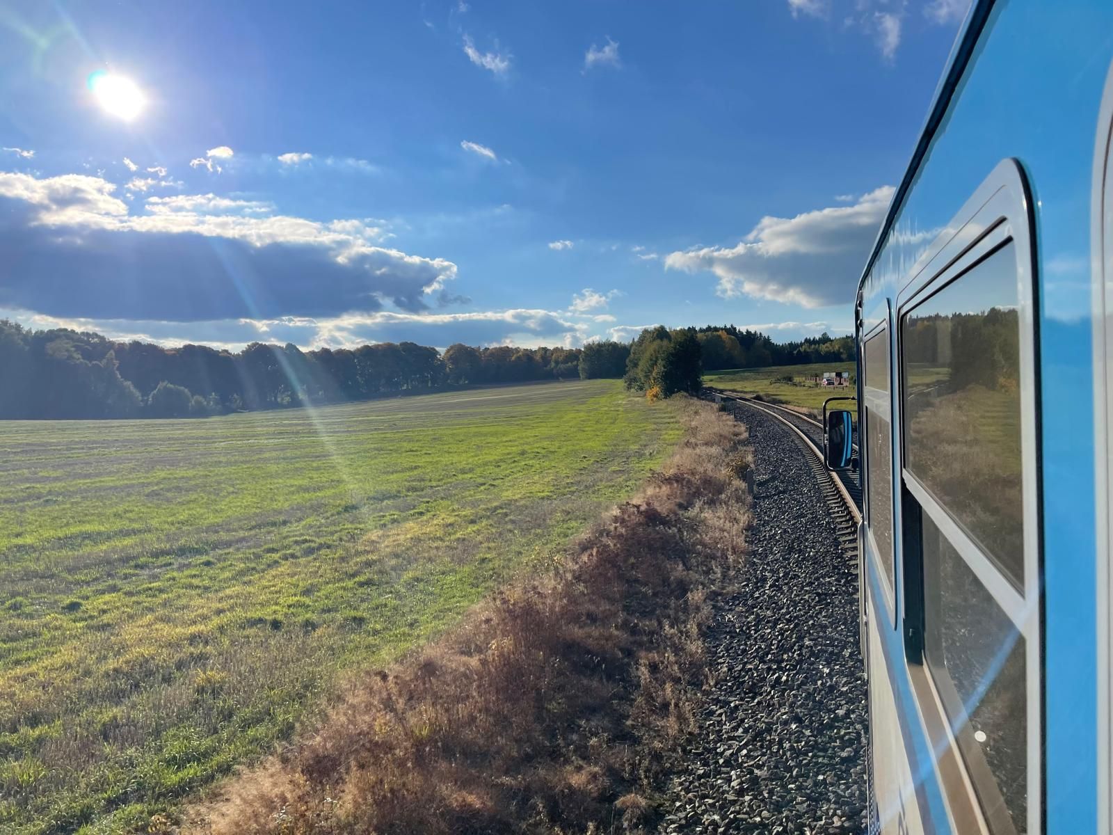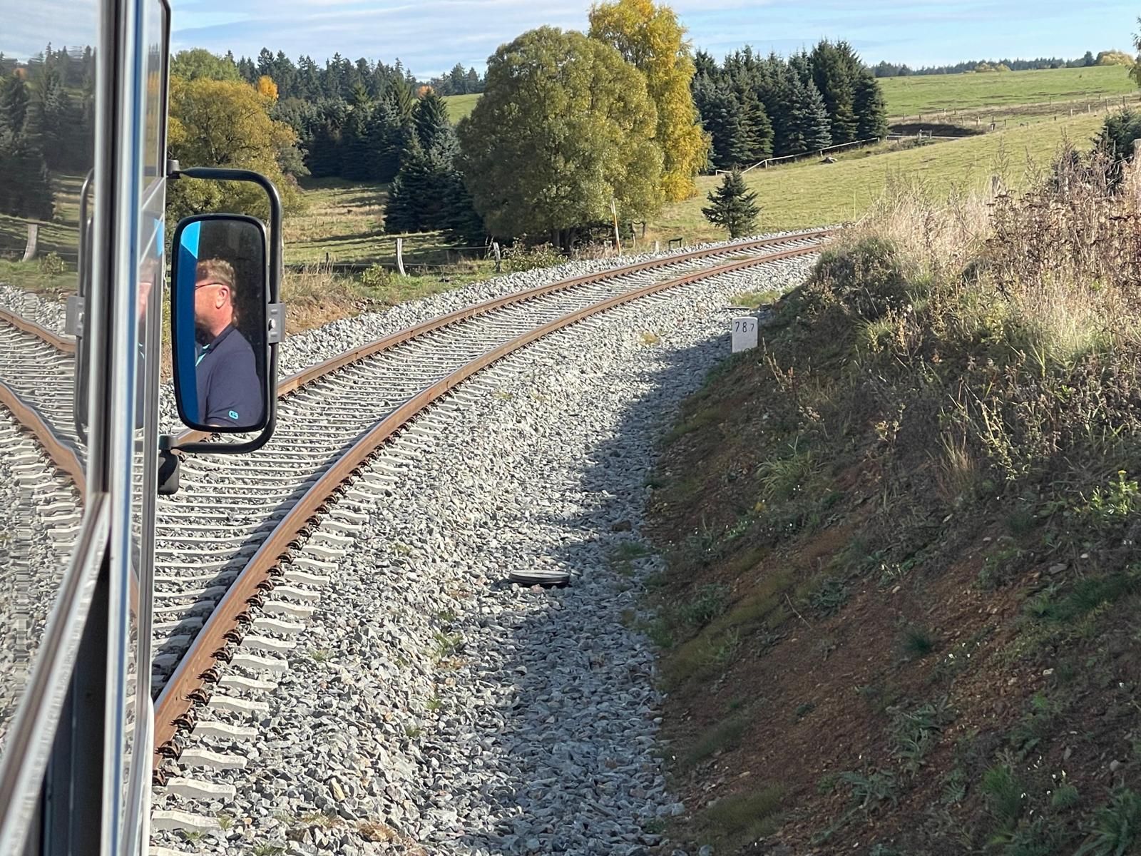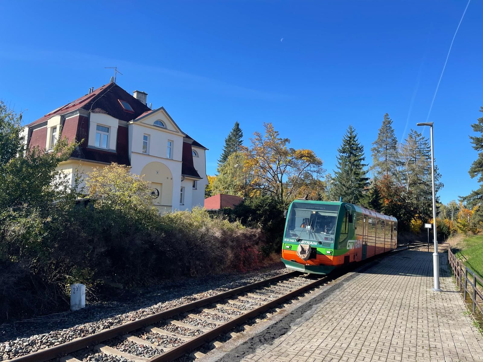Za okny je krásný podzim. Svítí slunce, barví se stromy a já mám pocit, že jsem na konci světa. Trať je tu od Správy železnic krásně udržovaná, prosekaná a na téměř zapomenutých zastávkách jsou typické čekárny, které byste našli i na dalších místech Karlovarského kraje. Nejedeme nijak rychle, na některých přejezdech je desítka nebo patnáctka a v lesních úsecích jsou z vlaku krásně vidět houby. Stačilo by zastavit a nasbírat si je. U zastávky Studánka se na přejezdu setkáváme s autobusem. Mikrobus z Aše do Hranic víceméně kopíruje trasu vlaku. A oba jedou z Aše v téměř shodný čas. Říkám si, jestli tohle není důvod, proč naším vlakem jedu sám.