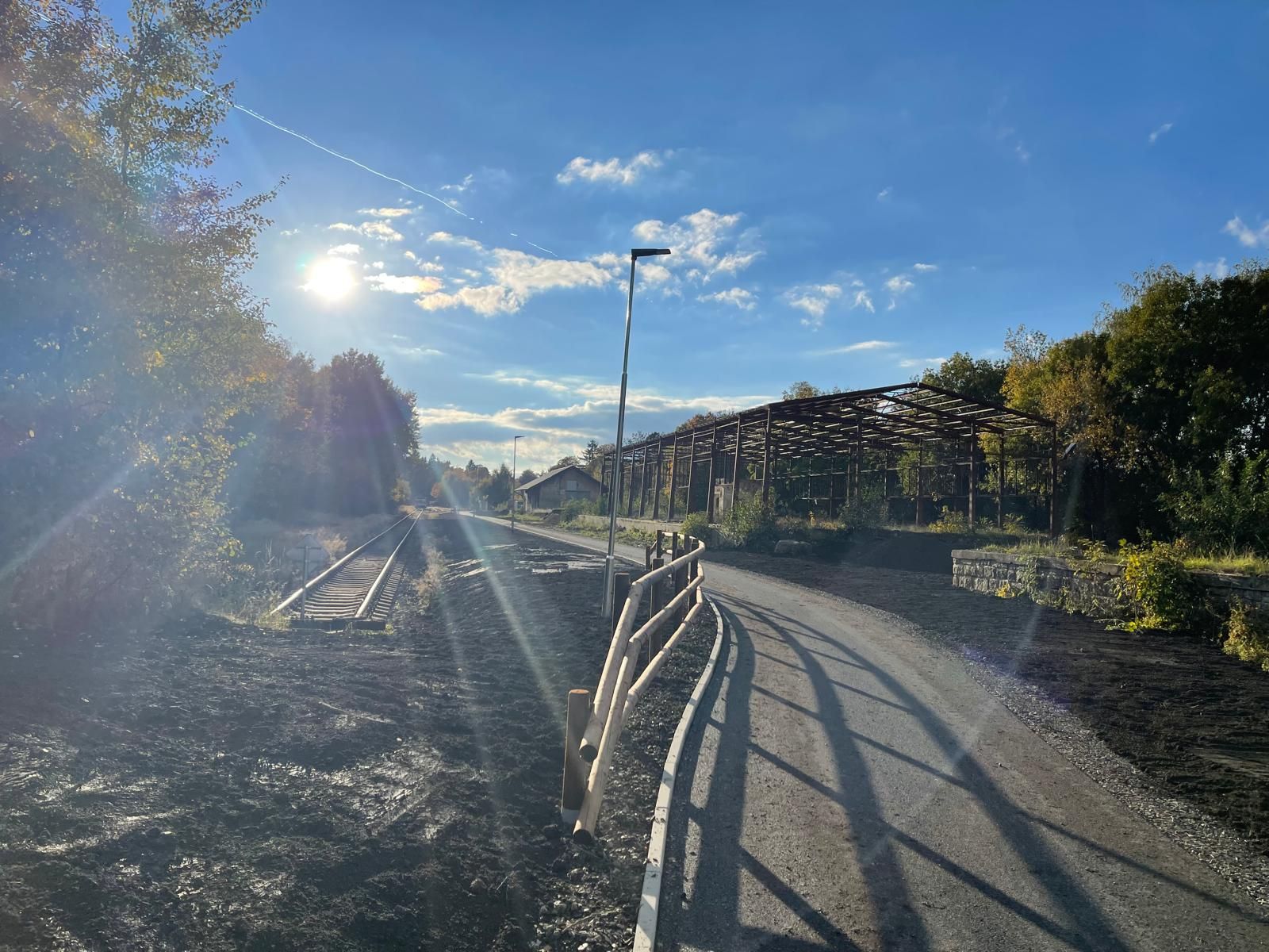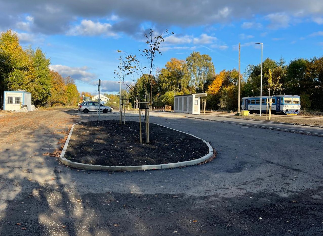 Za chvilku jsme v Hranicích v Čechách a já se nestačím divit. Právě se tu dokončuje proměna přednádražního prostoru. Nové parkoviště a točna pro auta, sadové úpravy s novými stromy a také nová cyklostezka, která vede na pozemcích bývalé stanice dál ve směru trati. A je vidět, že i Správa železnic tu dala koleje do pořádku. Včetně manipulační koleje. Po bývalé nádražní budově ani rozsáhlém kolejišti zdejší stanice není už ani památky. Jen si říkám, pro koho tu staví tak hezký a moderní prostor, když sem jede v pracovní den jen jeden vlak a o víkendu dva.