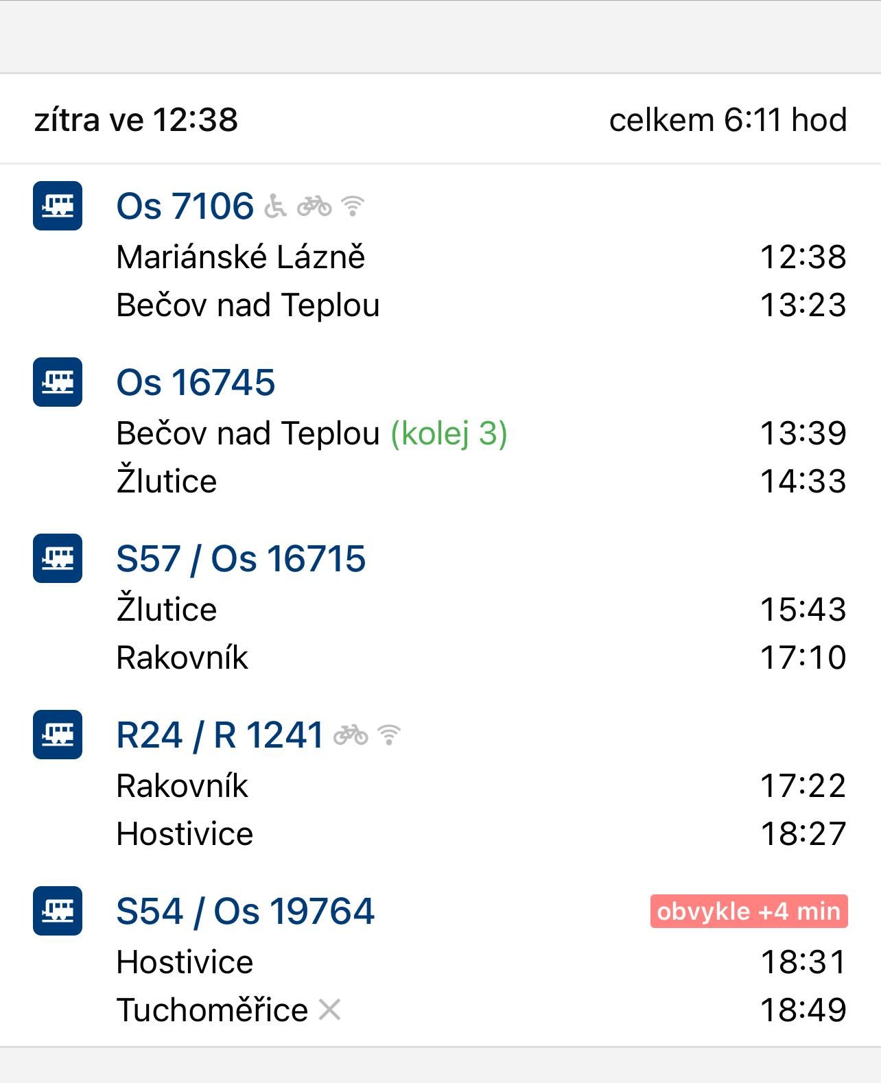 Cestou do Chebu se ve vlaku lidé střídají. Na většině zastávek někdo nastupuje nebo vystupuje a je vidět, že tady už vlak zase funguje a cestující ho využívají i takhle v podvečer. Pak už mě čeká jen rychlý přestup na prázdný Západní expres a za chvíli jsem v Mariánských Lázních. Pro dnešní cestu byla nejvýhodnější jízdenka za 199 korun pro celodenní cestování v Karlovarském kraji, kterou jsem si koupil v aplikaci ČD Můj vlak. Zítra pokračuji dál.