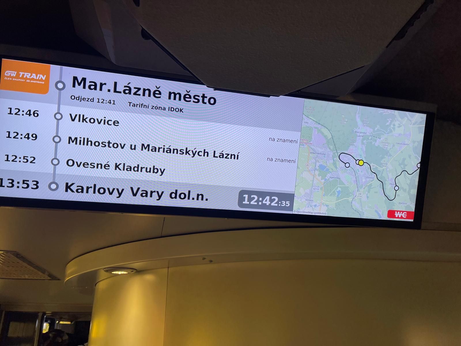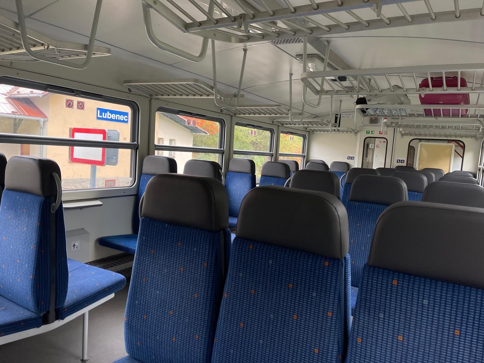 Na čas přijíždí RegioSprinter společnosti GW Train Regio. Moc cestujících nečekám, vyrážím ve 12.41, což je na školní děti nebo lidi z práce příliš brzy. Ale omyl. Nastupujeme do vlaku tři, takže celkem vlak veze i v tuhle polední hodinu z Mariánských Lázní 25 lidí, jeden kočárek a jednu koloběžku. Na všech zastávkách je pohyb. Někdo vystupuje, někdo nastupuje, ale největší obrat cestujících je v Teplé a pak v Bečově, kde většina z nás vlak opustí.