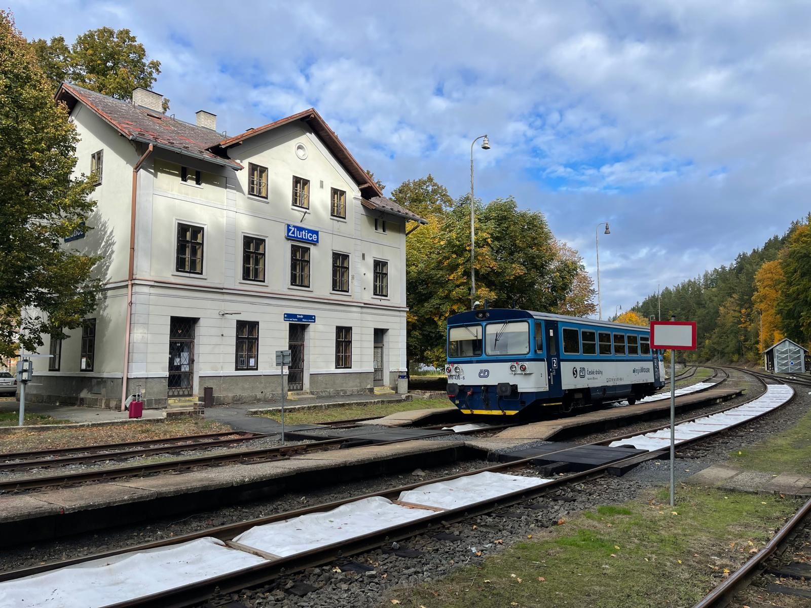 V úterý 14. října vyrážím na cestu z Mariánských Lázní přes Bečov, Žlutice, Rakovník a Hostivici do středočeských Tuchoměřic. Můj kamarád mi řekl, že tohle je šotocesta roku a má vlastně pravdu. I když podle mapy je to nejpřímější spojení, jel by tak opravdu jen blázen. Vyzkouším si pět regionálních vlaků tří dopravců a pokud všechno klapne, pojedu něco přes šest hodin. Začínám na zastávce Mariánské Lázně město. Správa železnic tu zrovna opravuje nástupiště a já přes zavřené dveře nahlížím do kompletně vybydlených prostor, kde dříve bývala čekárna a prodejna jízdenek. Moc lázeňsky a reprezentativně to nevypadá.