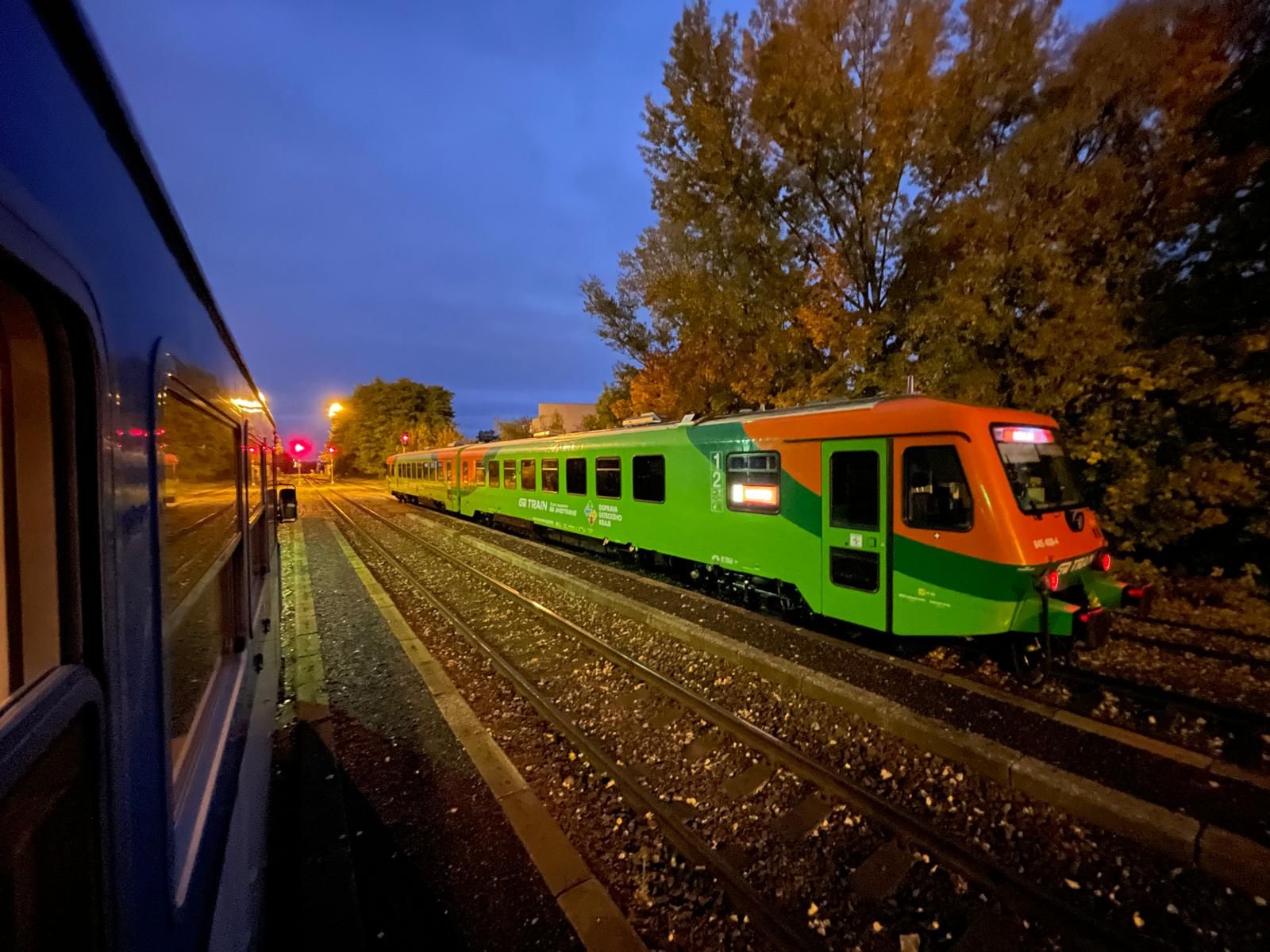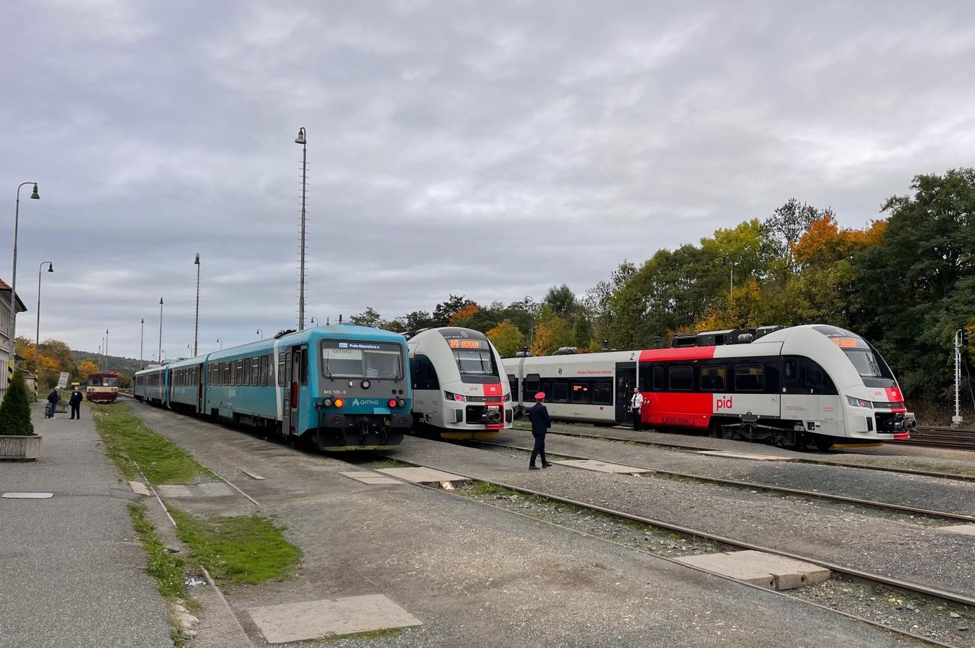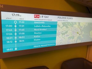 Přestupuju do rychlíku Arrivy, zapínám si počítač a mám v tichém oddíle u velkého stolu klid na práci. Najednou jsem ve vlaku, který jede o dost rychleji. Směrem ke Kladnu lidé postupně přistupují, ale je nás v celém vlaku jen hrstka. V Hostivicích přestupuji na motorák do Noutonic. Dnes sedm cestujících. Je to trochu méně než v jiné dny, kdy tento spoj občas využiji. Všichni jedou do Amazonu na novou zastávku, která u tohoto logistického centra vznikla v Dobrovízi. Dál už jedu sám. Ve stanici Středokluky mě ale čeká poslední překvapení dnešní cesty. Křižujeme se tu s rychlíkovou motorovou jednotkou GW Trainu.