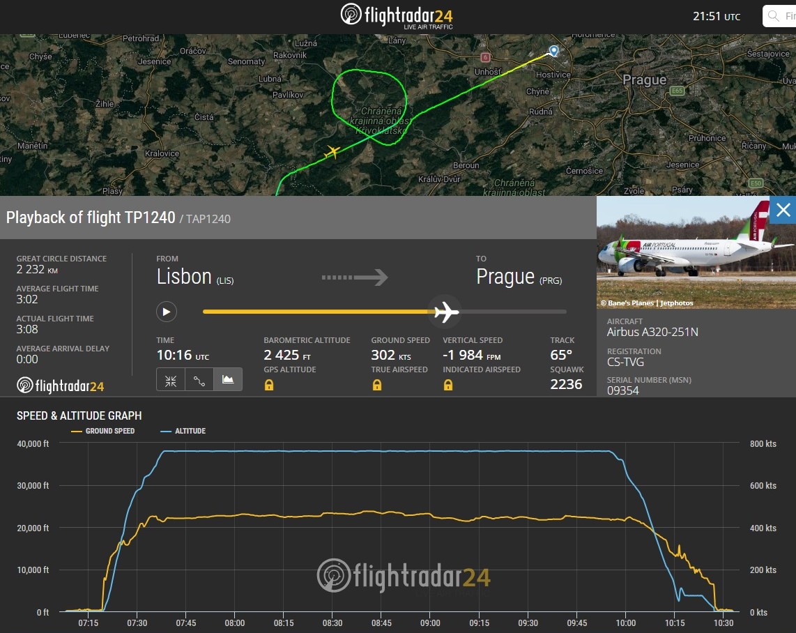 Situaci a přibližná data zachycuje záznam letu a letových údajů z aplikace Flightradar24. Přikládáme jej níže, celý záznam najdete pod číslem letu TP1240 zde. Zdroje ohledně přesné výšky se rozcházejí, Flightradar navíc vzorkuje co 2 sekundy.