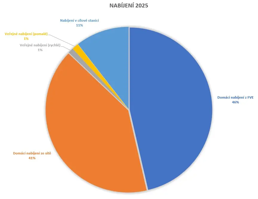 Zhruba 30 % spotřeby v roce 2025 tvořil provoz dvou elektromobilů. Na celkový nájezd vlastního auta 15 500 km bylo nabito přes 2400 kWh doma a dalších 400 kWh mimo domov. Necelých 50 % nájezdu tak tvoří nabíjení z FVE, 40 % nabíjení doma ze sítě a zbytek pak nabíjení na rychlonabíječkách nebo v cílové stanici.